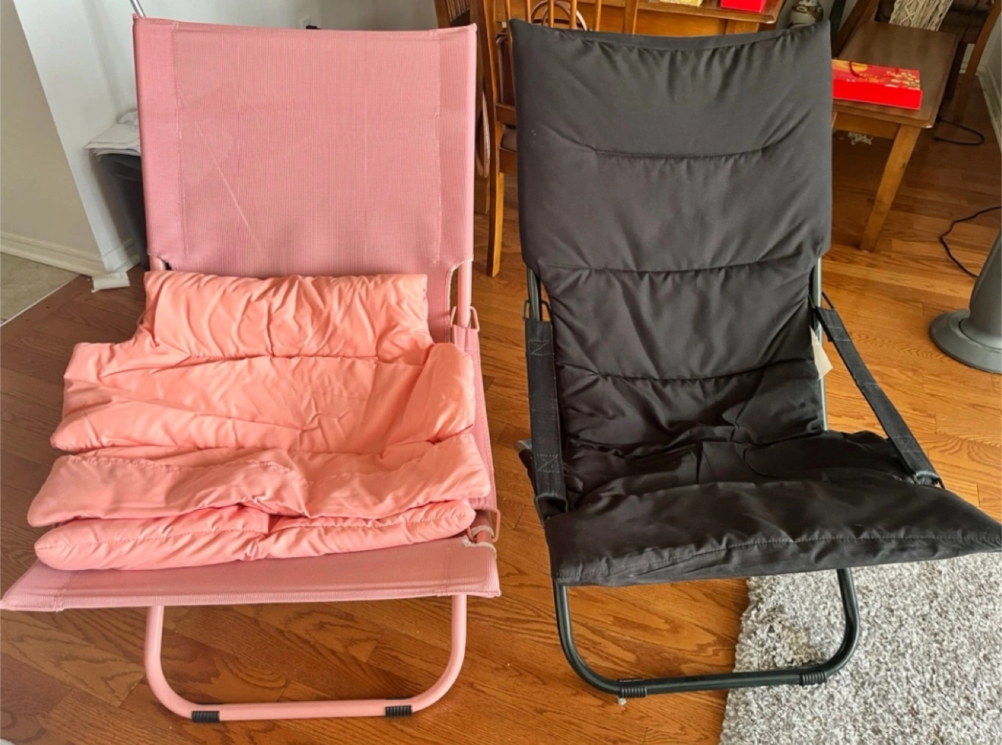 Selling two folding beach chairs. One is pink and the other is black. Great for relaxing at the beach or in the backyard!