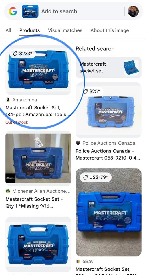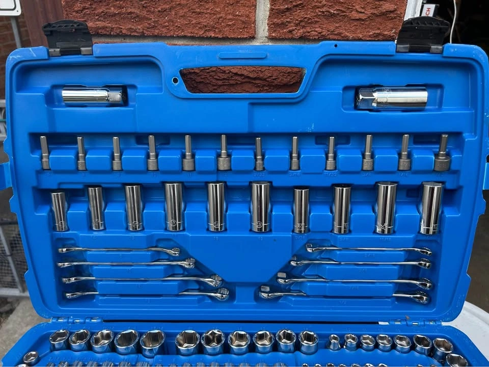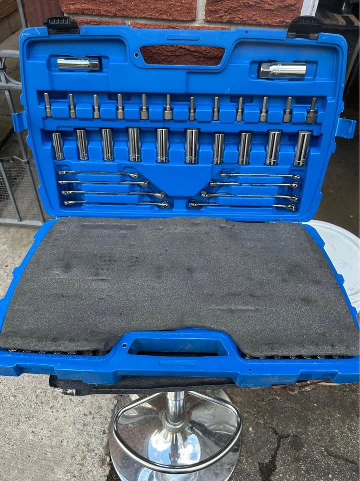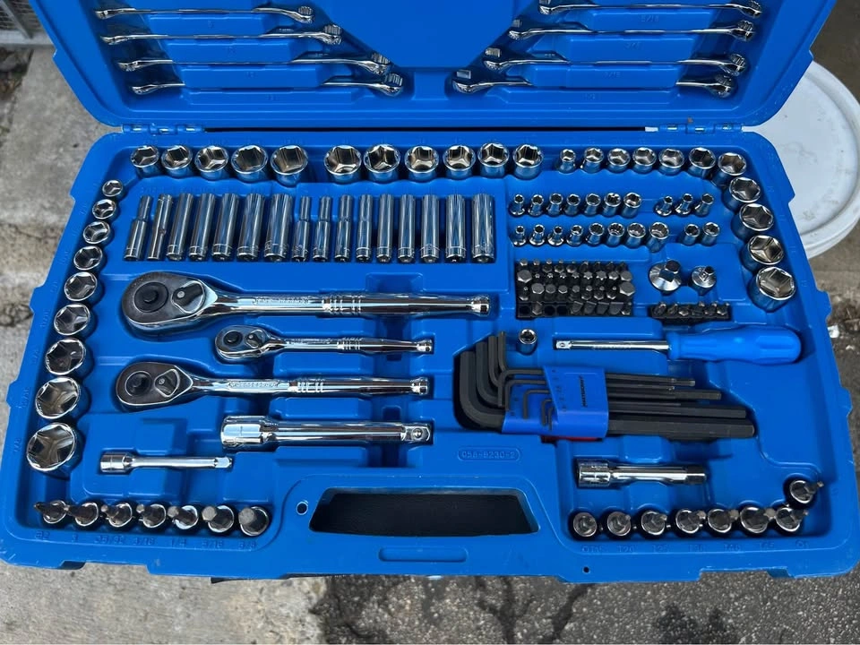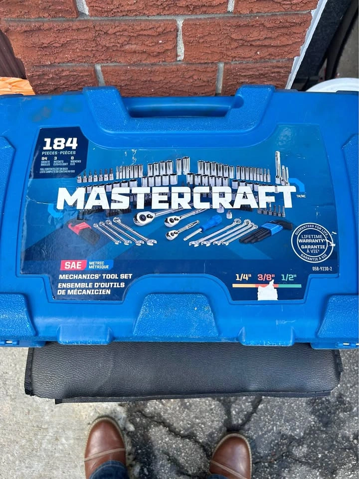 Mastercraft Socket Set is perfect for any job or purpose with an all-inclusive 184 piece set. Comes in a sturdy blow mould case for easy storage and portability. Fully polished nickel-plated finish provides easy maintenance and rust resistance. High visibility size marking allows for quick and easy to read selection. Shallow broach deep socket lets you start fasteners with ease. Anti-rounding socket walls reduce fastener rounding. Includes ¼"drive: 20 regular sockets, 16 deep sockets, one ratchet, one spinner handle, one extension bar, one bit holder. Includes 3/8" drive: 20 regular sockets, 16 deep sockets, 15 bit sockets, two spark plug sockets, one extension bar, one ratchet. Includes ½"drive: 11 sockets, one ratchet, one extension bar. Includes: 30 screwdriver bits, 18 hex keys (SAE and metric), 10 combo wrenches and more. Let me know if you're interested!