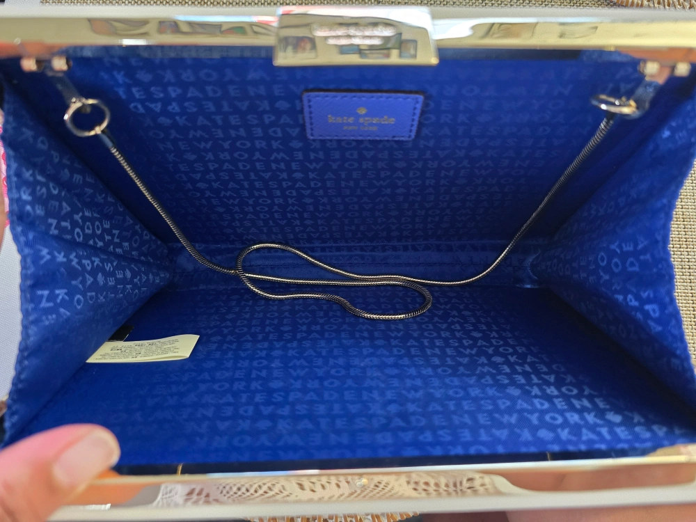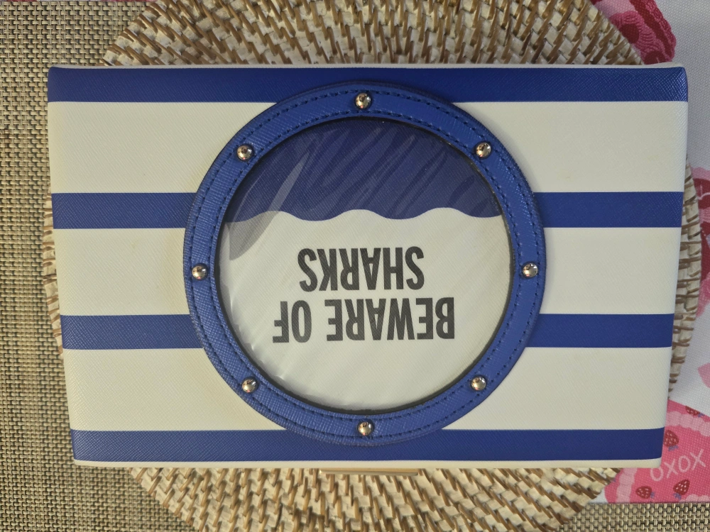 This Kate Spade clutch features a fun nautical theme with blue and white stripes and the phrase "Beware of Sharks"! The interior is a vibrant blue with a chain strap. It's a stylish and unique accessory for any outfit