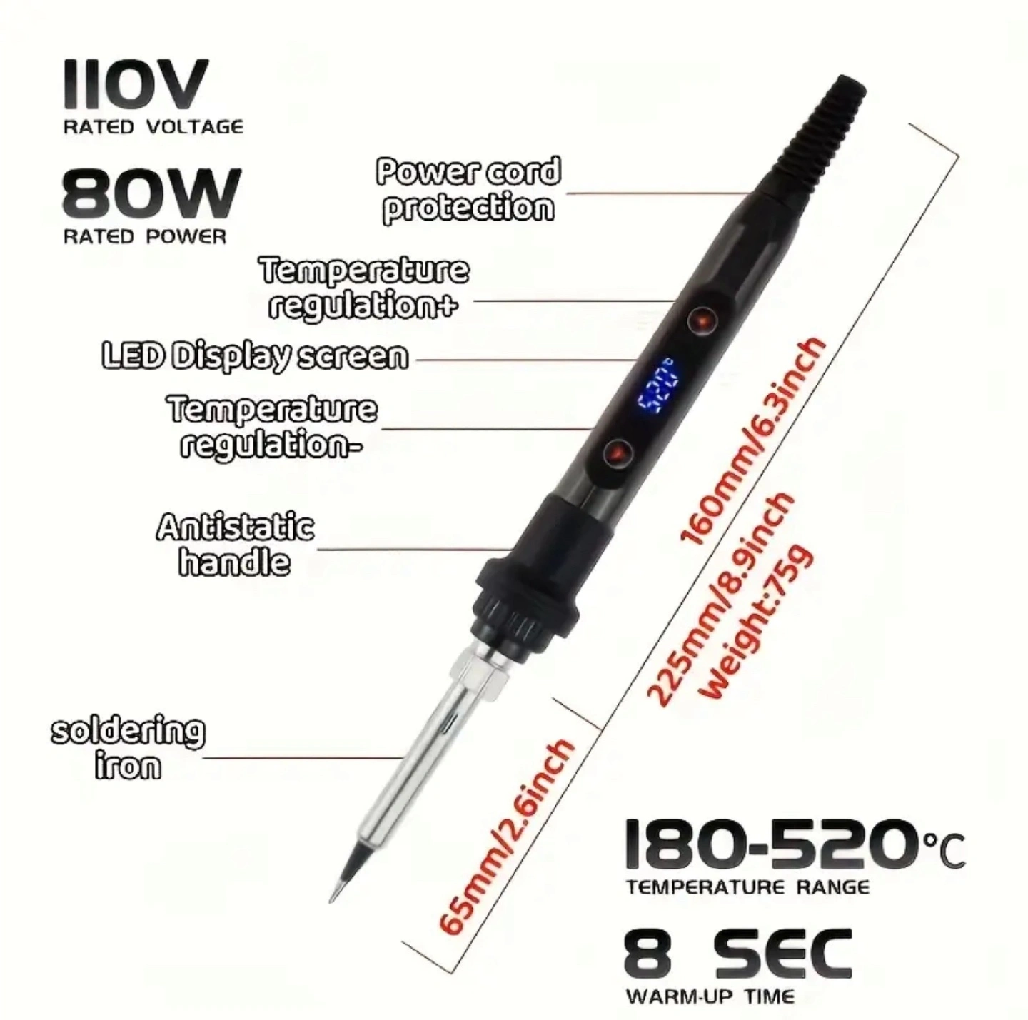 Looking to sell this soldering iron kit and multimeter set. It includes a soldering iron with adjustable temperature, a multimeter with a blue backlit screen for easy reading, and a desoldering pump. The soldering iron has a temperature range of 180-520°C and a warm-up time of 8 seconds! Great for electronics projects and repairs