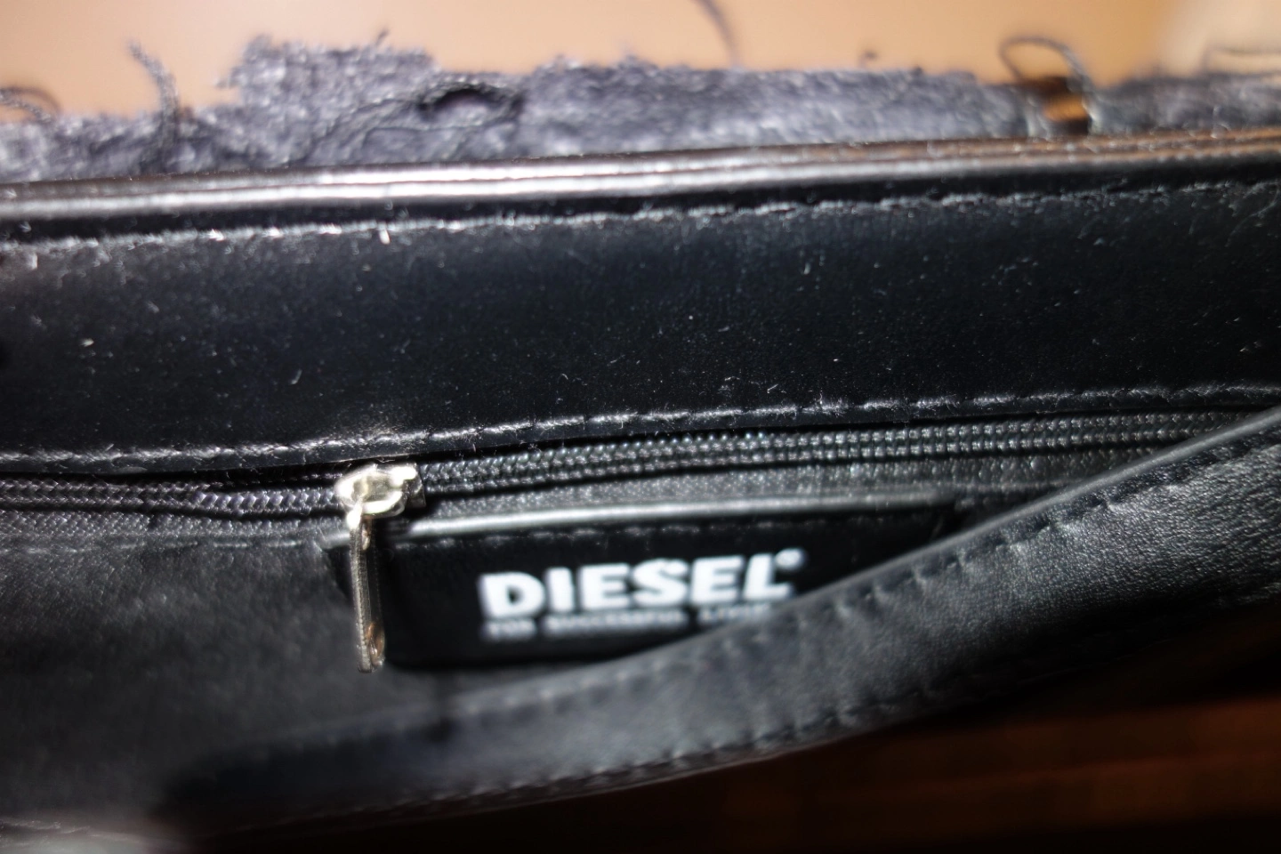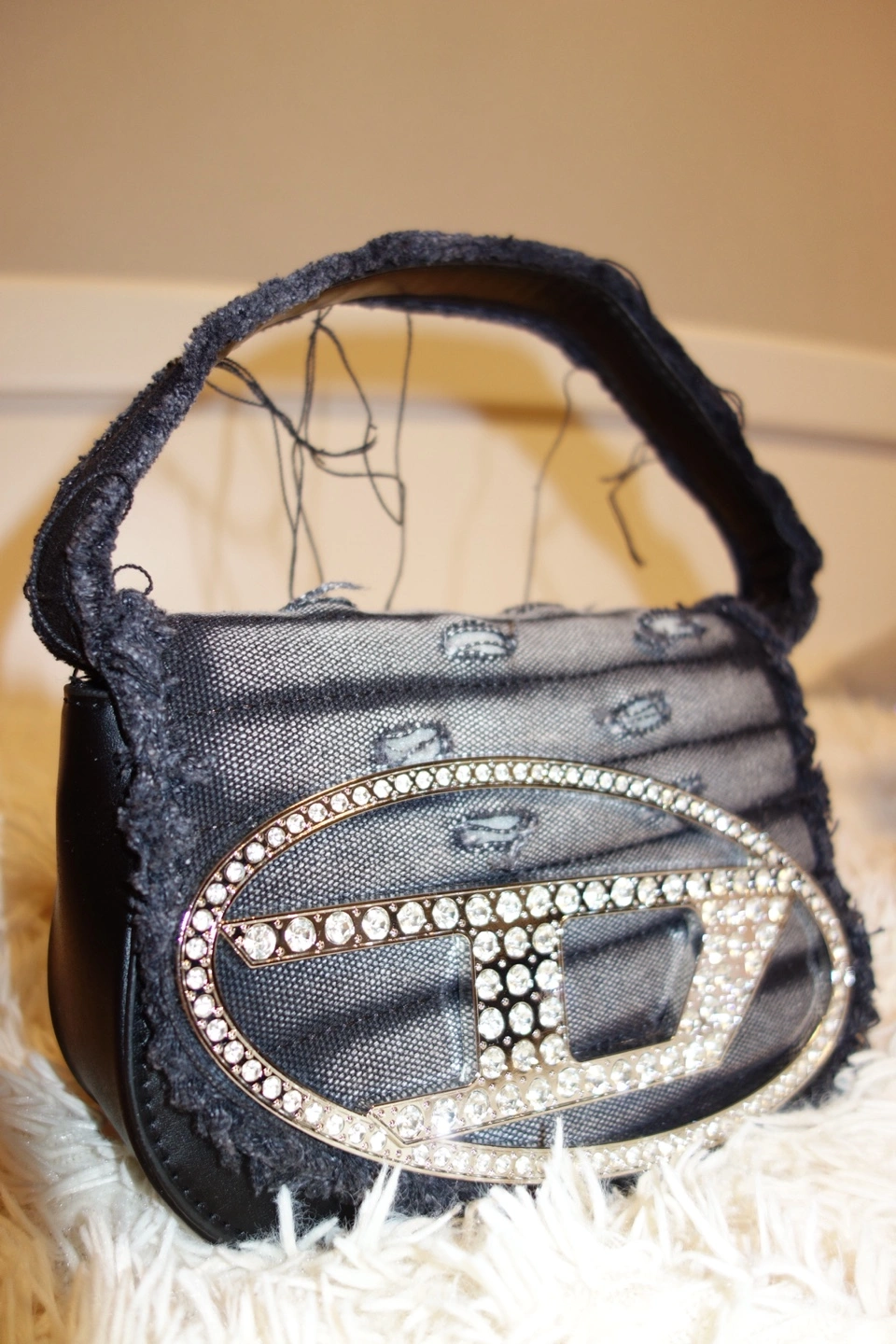 Check out this Diesel bag! It features a denim exterior with rhinestone detailing on the logo. It's a super cute and stylish accessory to add to your collection!