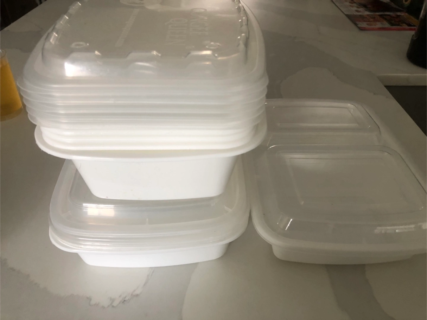 I have a couple containers from getting takeout. They're perfect for meal prepping or storing leftovers. The containers are white with clear lid, and they come in a convenient size for fridge and freezer storage. Free.
