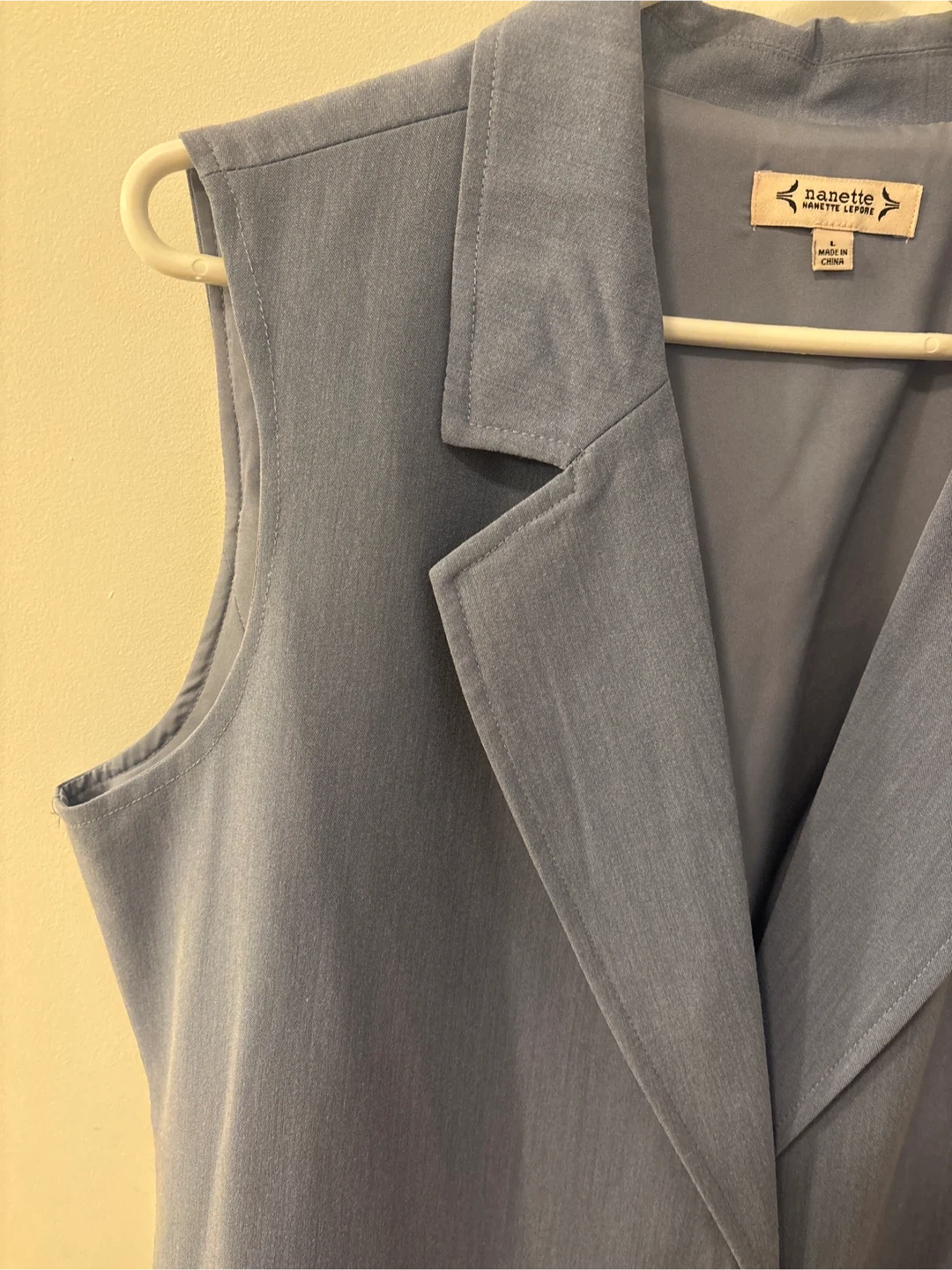 This is a new with tags stylish Nanette Lepore sleeveless blazer vest in size L. It's in excellent condition and ready to add a touch of sophistication to your wardrobe. The light blue color is versatile and perfect for layering!