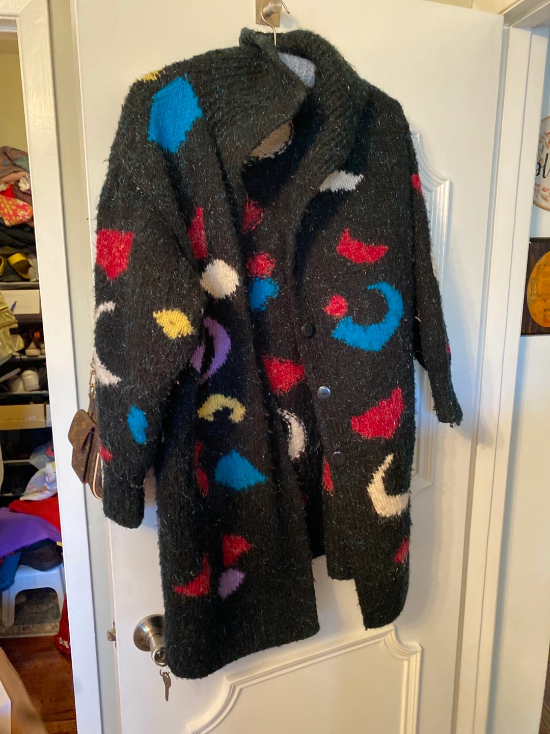 Selling a cozy knit cardigan with a unique and colourful pattern! It's in great condition and perfect for adding a pop of fun to any outfit. It has a button-up design and is made of a soft, comfortable material. Perfect for layering on those cooler Canadian days!NO SIZE but is like xl or XXL