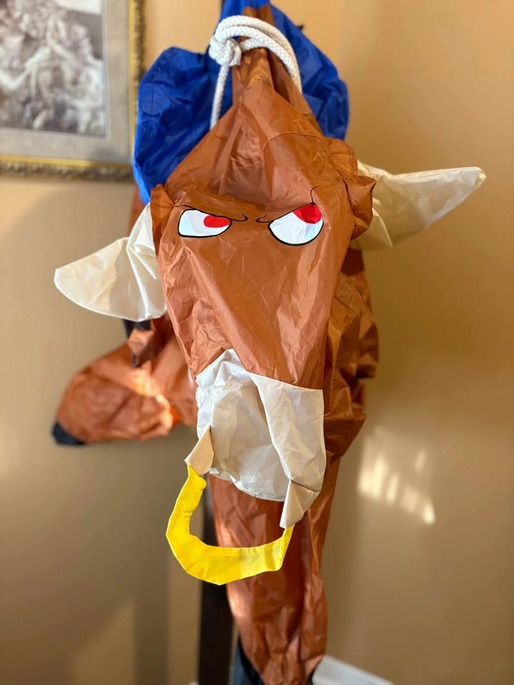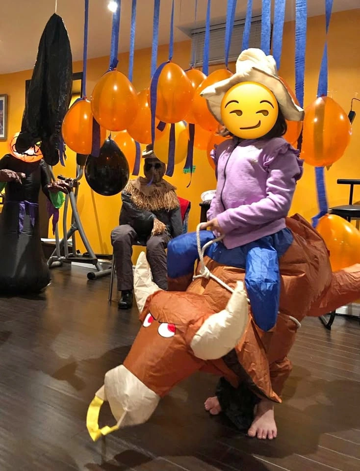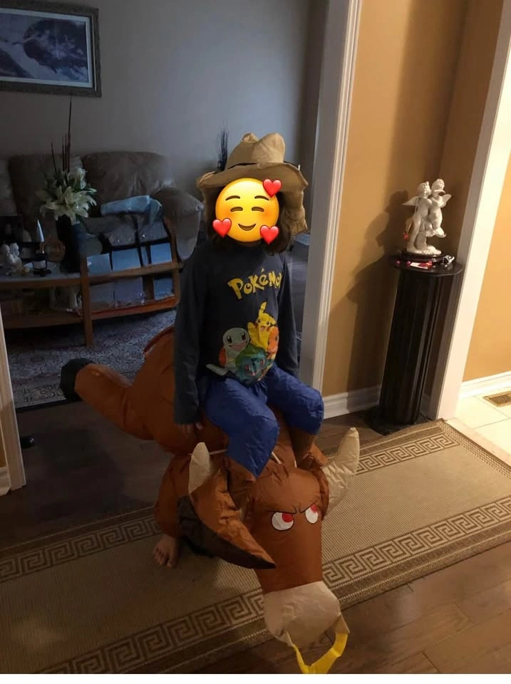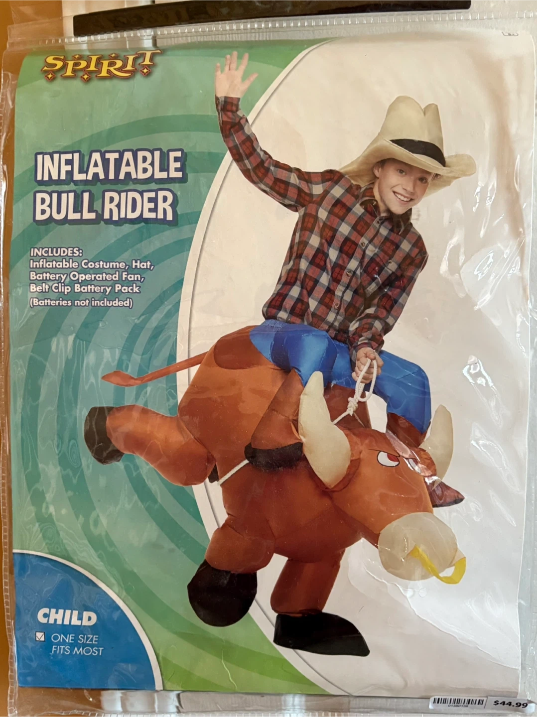 Rope in all the candy when you dress up in this kids inflatable bull rider costume! This funny costume is the perfect Halloween look when you want to have fun and get all the applause (and candy) from everyone who's laughing along with you. (Generous fit due to design) Includes: Inflatable costume Hat Battery-operated fan Belt Clip battery pack Battery type: 4 AA 1.5V batteries (not included) Cash only -pick up Richmond hill