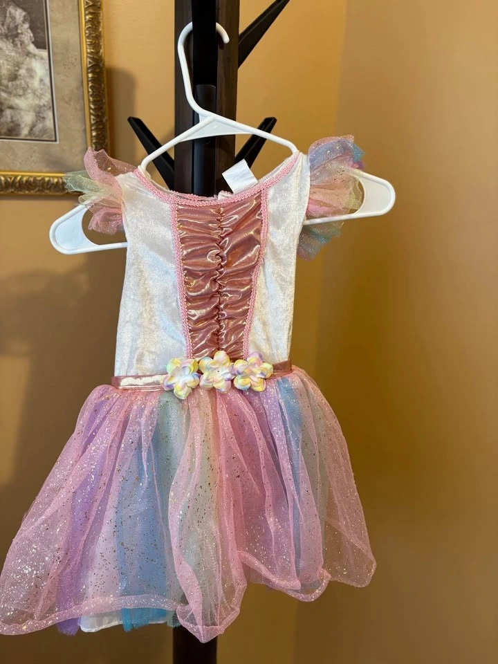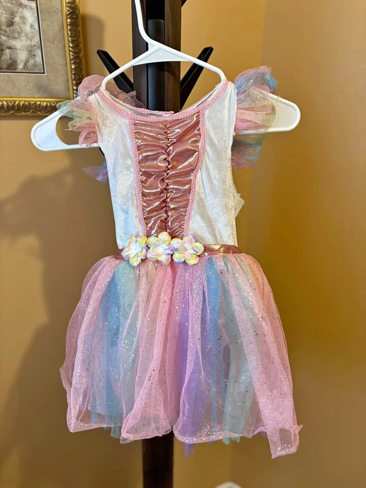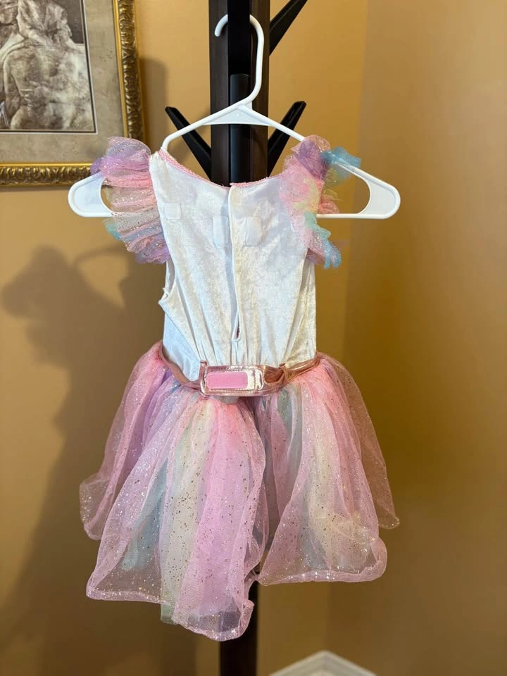 Selling a cute rainbow unicorn dress! It features a white bodice with pink and gold accents, and a multi-coloured tulle skirt with gold glitter details. Perfect for dress-up or a Halloween. Cash only -pick up Richmond hill