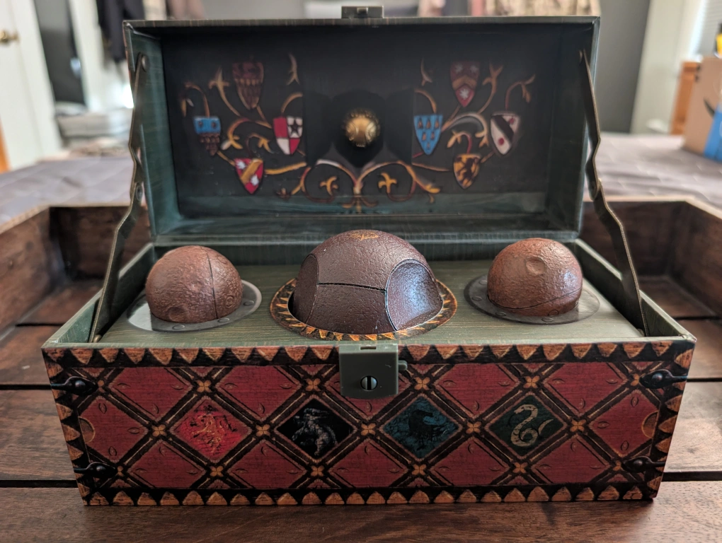 The box is similar to the size of a standard box of Kleenex. Inside you'll find a removable Quaffle (with Hogwarts logo) and two removable Bludgers. Note that the snitch is NOT removable.