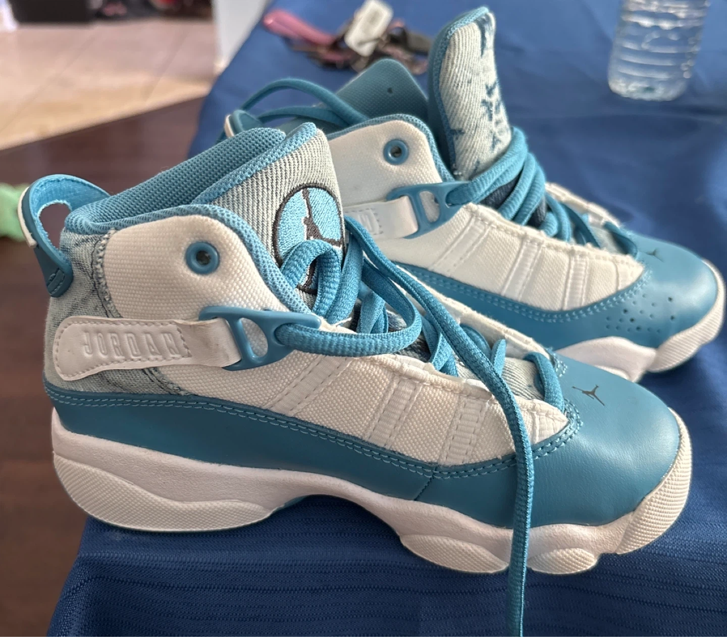 Selling a pair of Jordan 6 Rings toddler shoes in size 12 c They feature a stylish blue and white colourway, perfect for your little one!