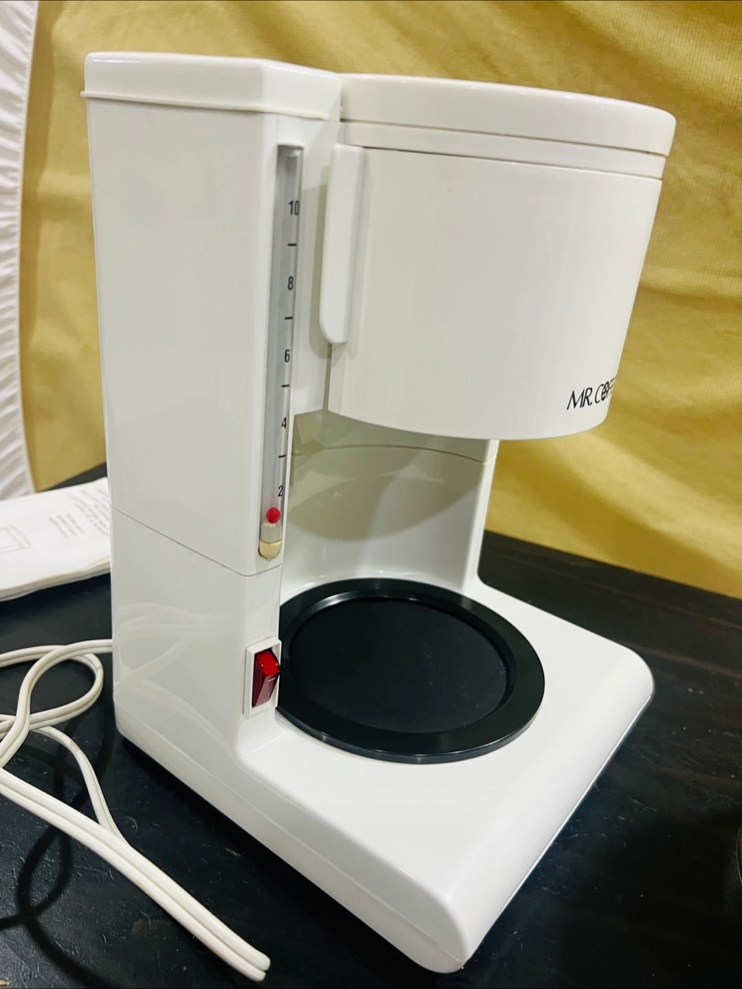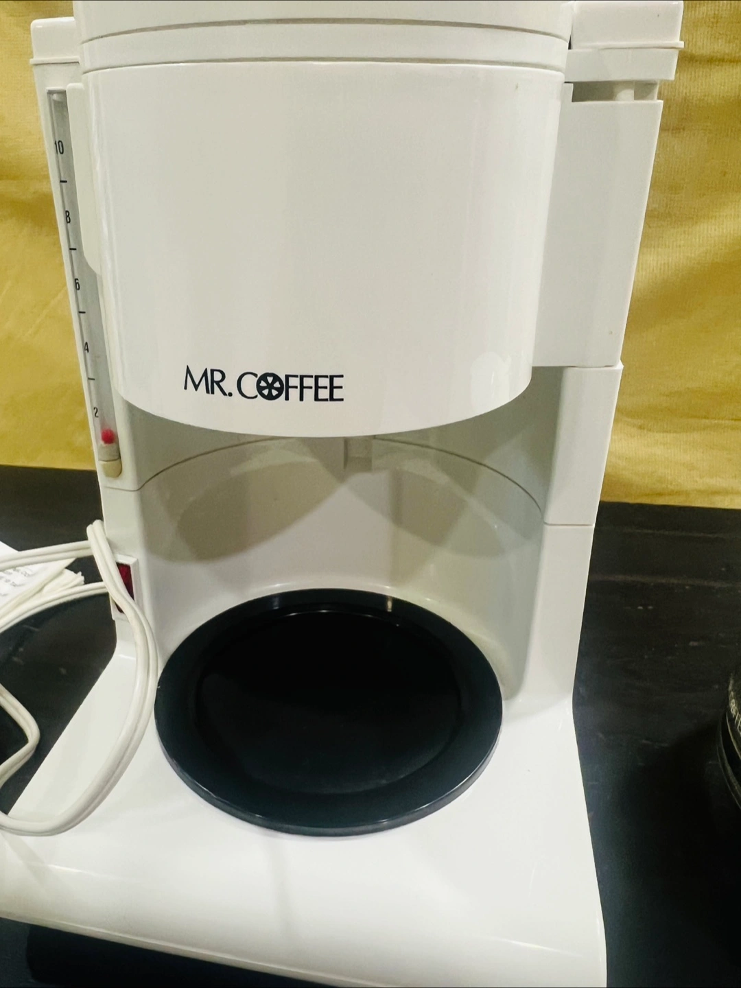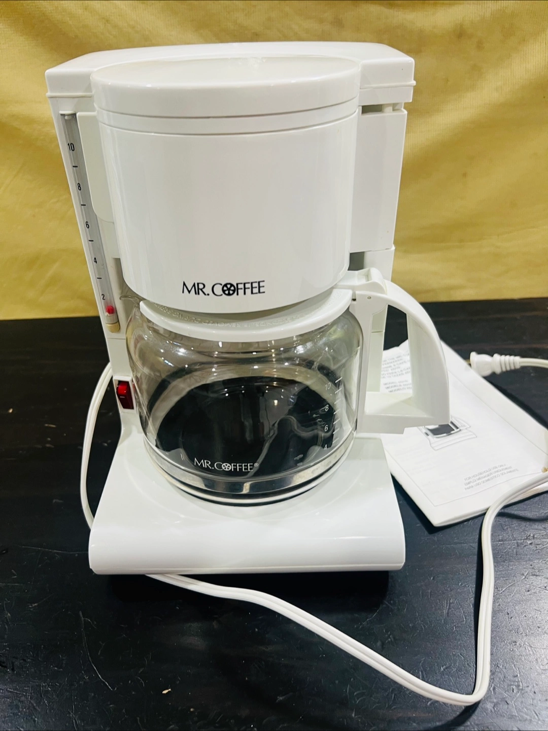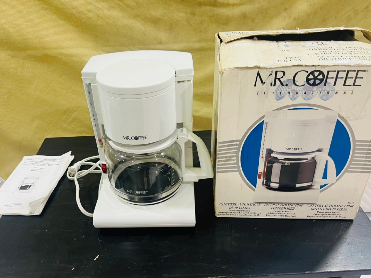 19Selling a Mr. Coffee International coffee maker in white. It's a 10-cup automatic drip model. The box is included, and it features Pause 'n Serve, a removable filter basket, and dual water windows.