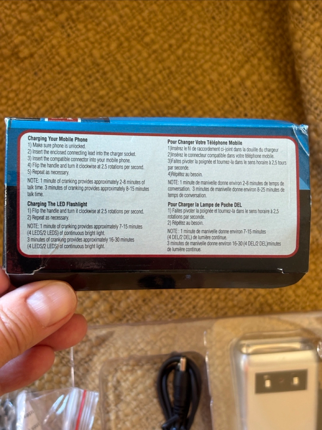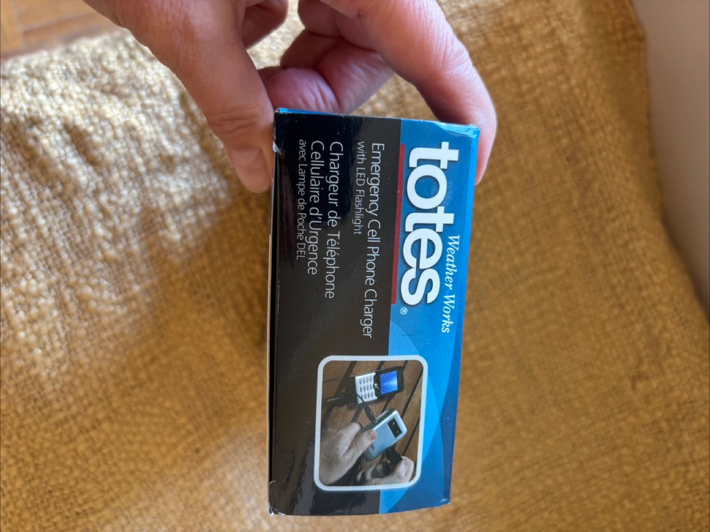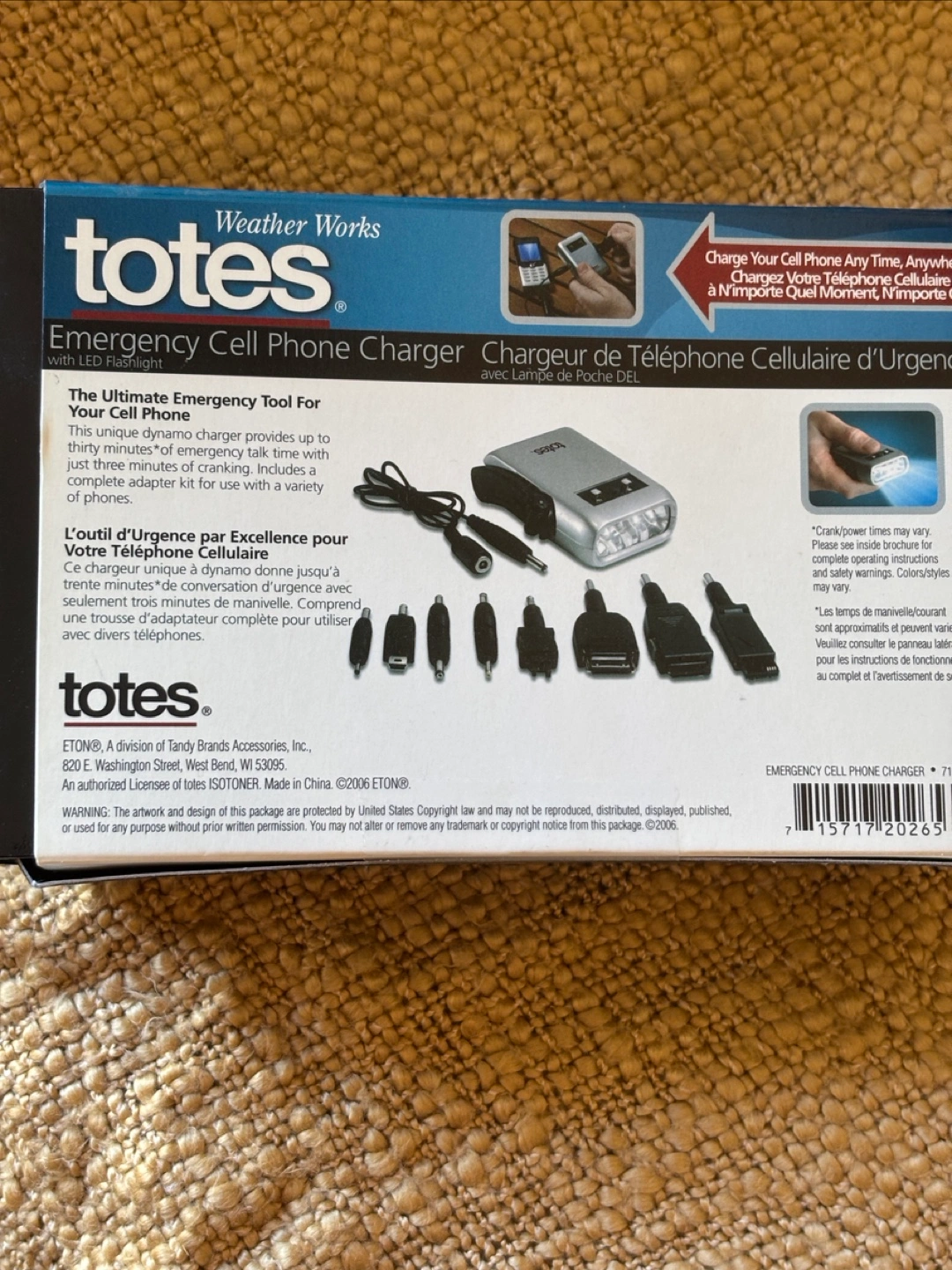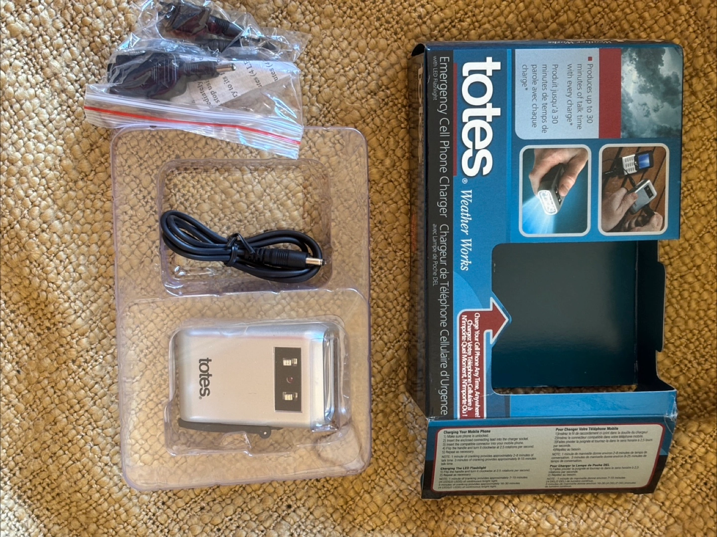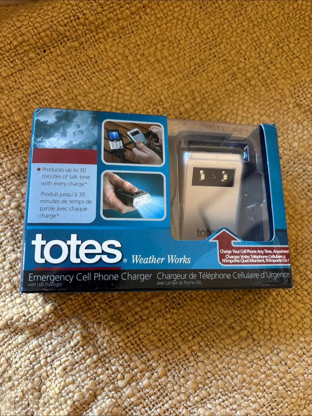Brand new in box Totes Weather Works Emergency Cell Phone Charger with LED Flashlight! This ultimate emergency tool is perfect for your cell phone. Includes a complete adapter kit for use with a variety of phones. From a PF and SF home. Pickup only in the St Lawrence market area of downtown Toronto. Cash only.