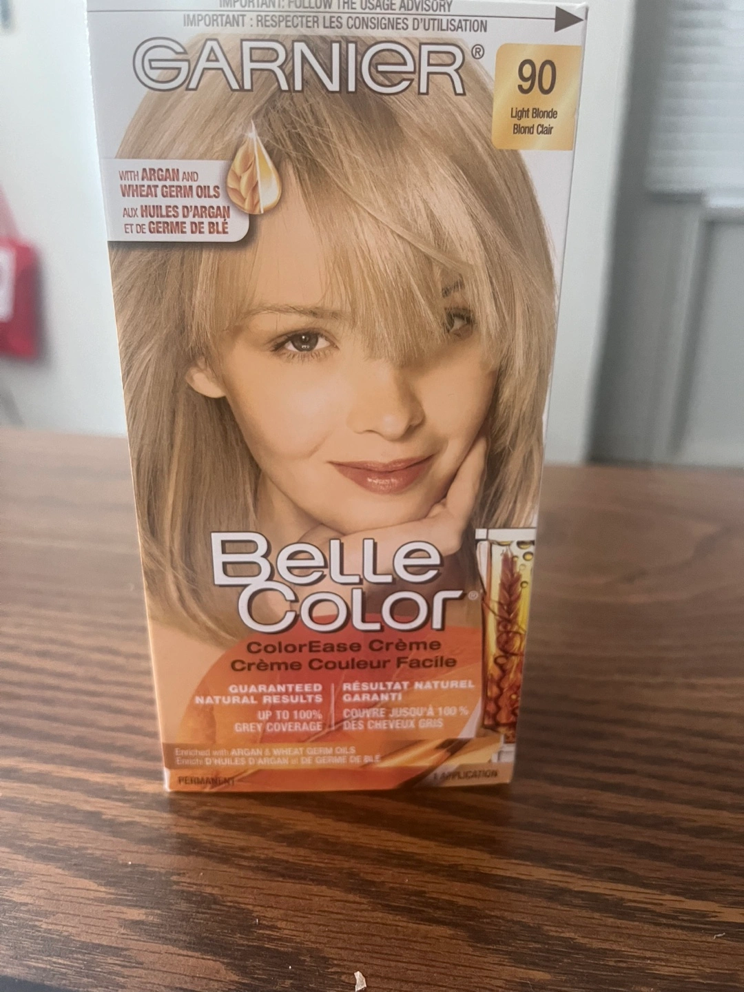 Selling a box of Garnier Belle Color hair dye in shade 90, Light Blonde. This ColorEase Crème formula guarantees natural results and up to 100% grey coverage. It's enriched with Argan and Wheat Germ oils for a permanent application.