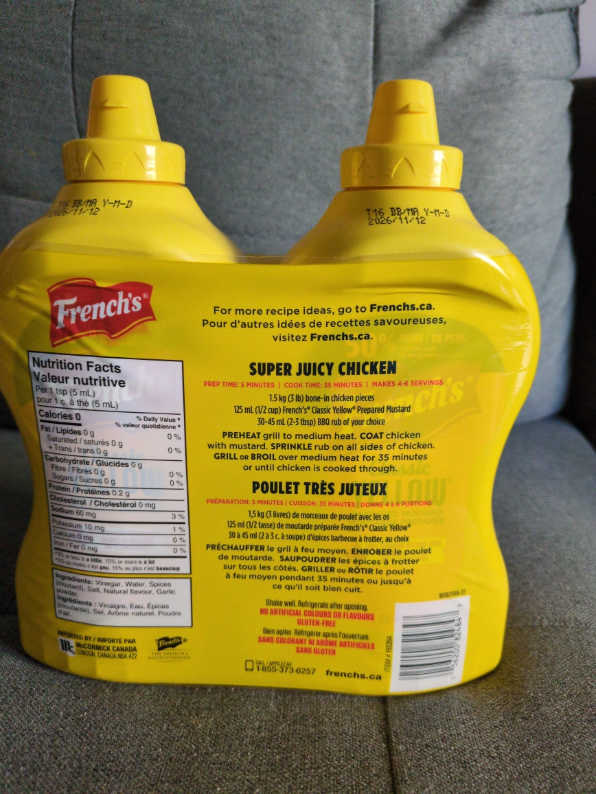 Selling a brand new, unopened French's Classic Yellow Mustard value pack. You get two 830 mL bottles, perfect for all your summer BBQs and sandwiches! Expiry Date: 2026 November 12