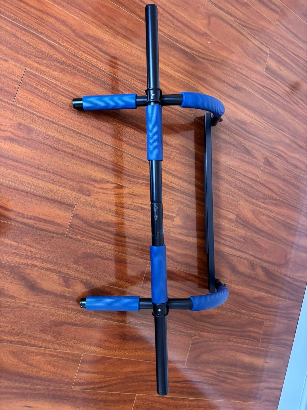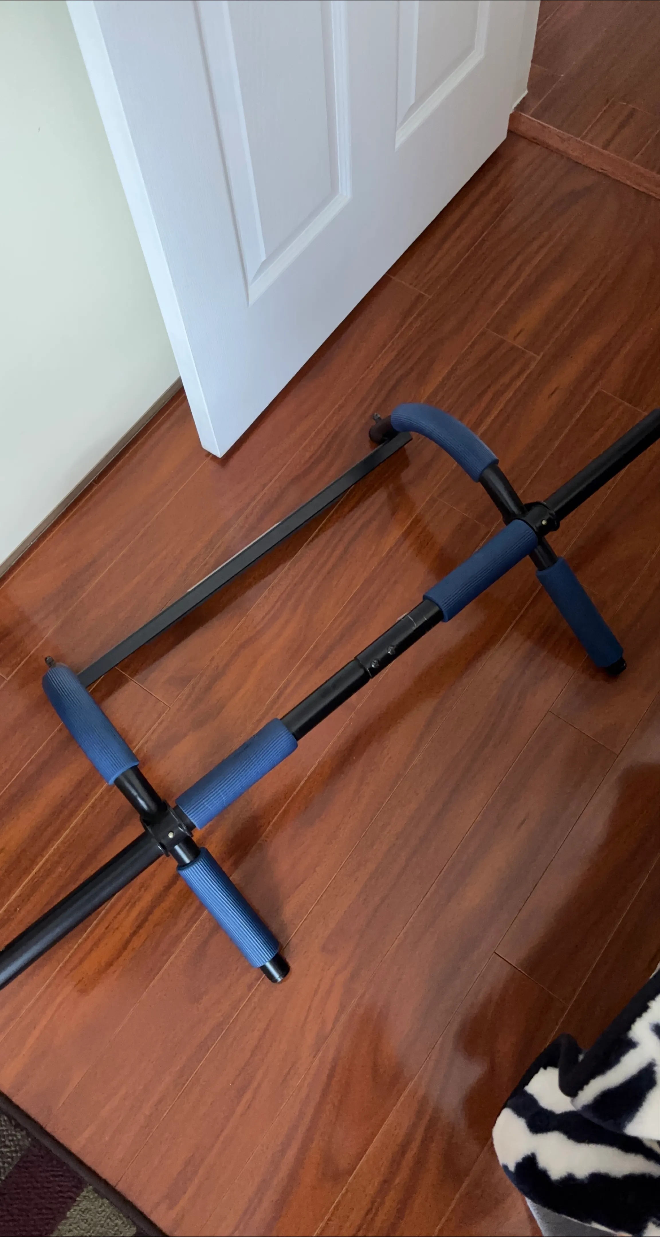 It's perfect for getting a quick workout in at home. The bar is black with blue foam grips for added comfort.