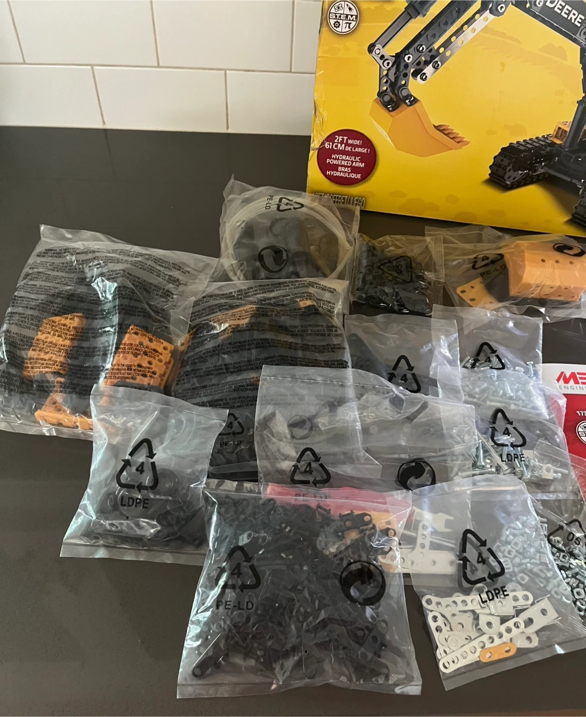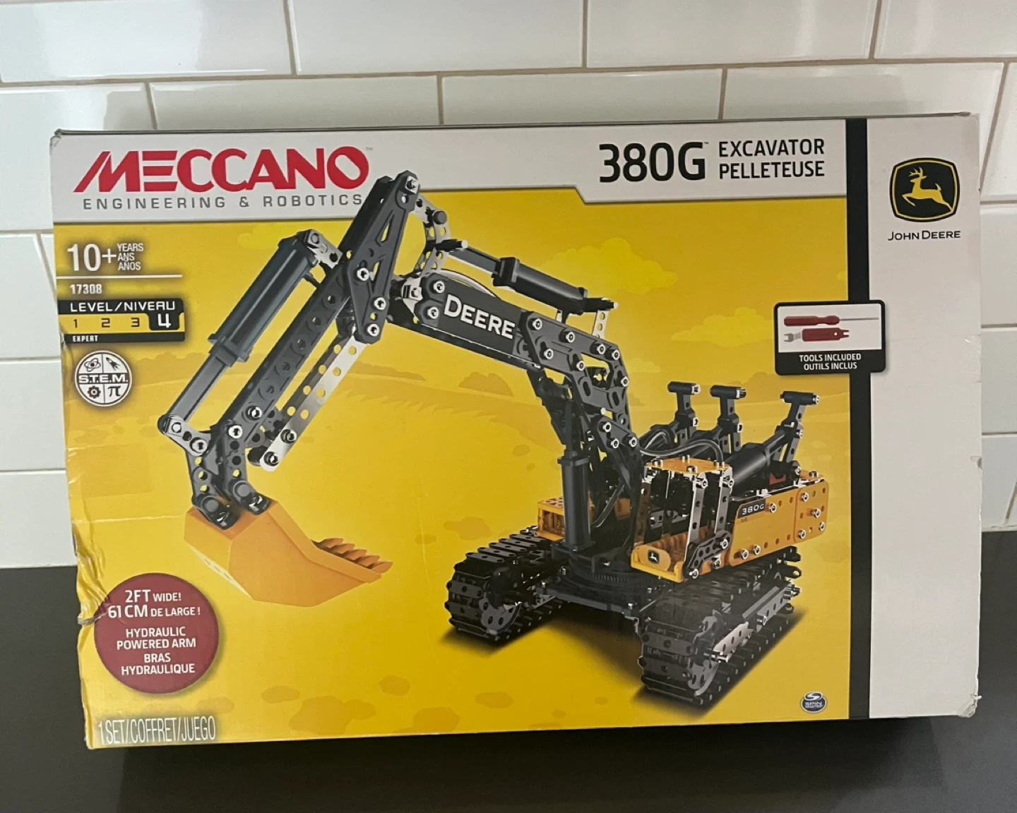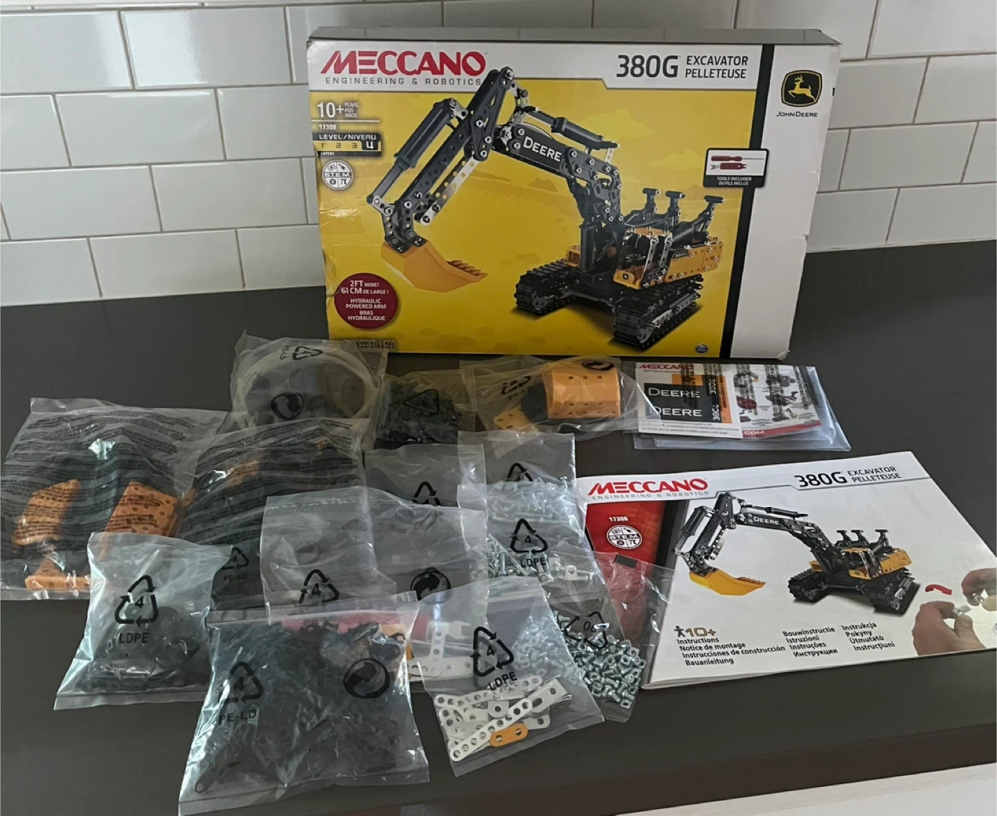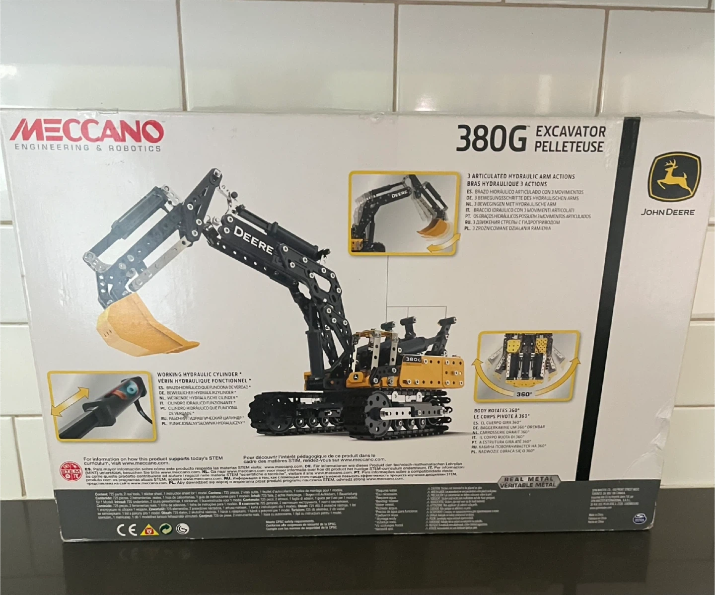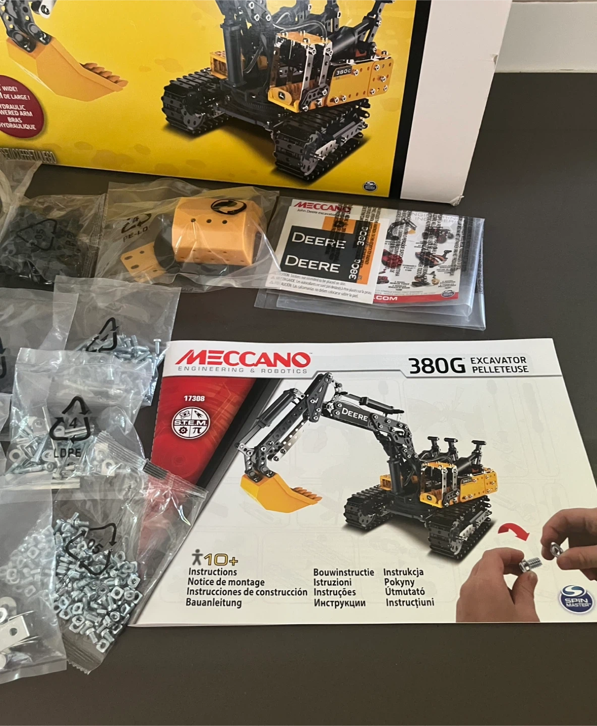 41Selling a Meccano Engineering & Robotics John Deere 380G Excavator construction set! It's suitable for ages 10+. The box includes all the pieces, instructions, and tools to build a 2-foot-wide hydraulic powered arm excavator. Box has been opened to show all parts, the bags have not been opened.