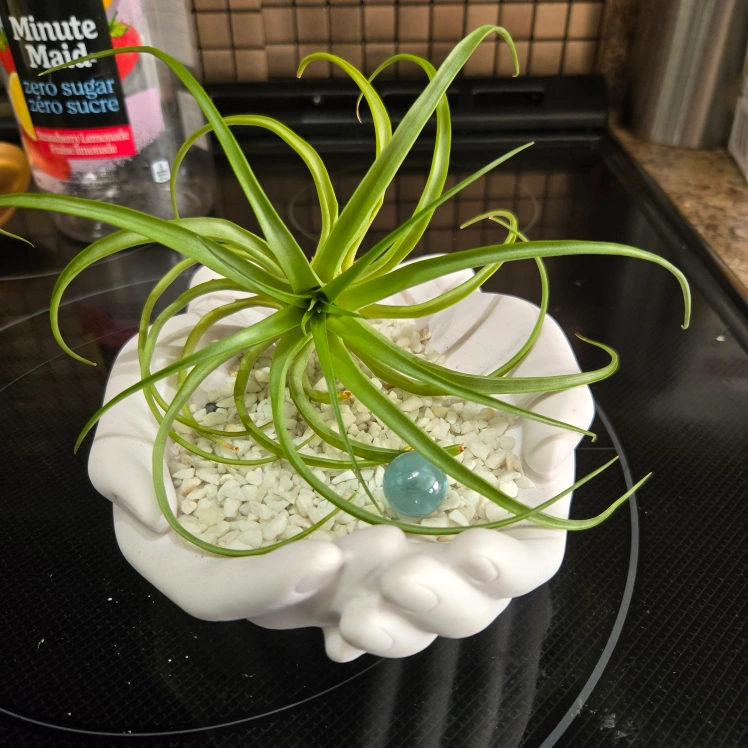 Cute air plant nestled in a unique hand-shaped planter! It's a lovely little decorative piece that adds a touch of green to any space. The planter is white and holds small white stones with a blue glass bead, creating a serene and stylish look. It's in great condition and ready to bring some life to your home!