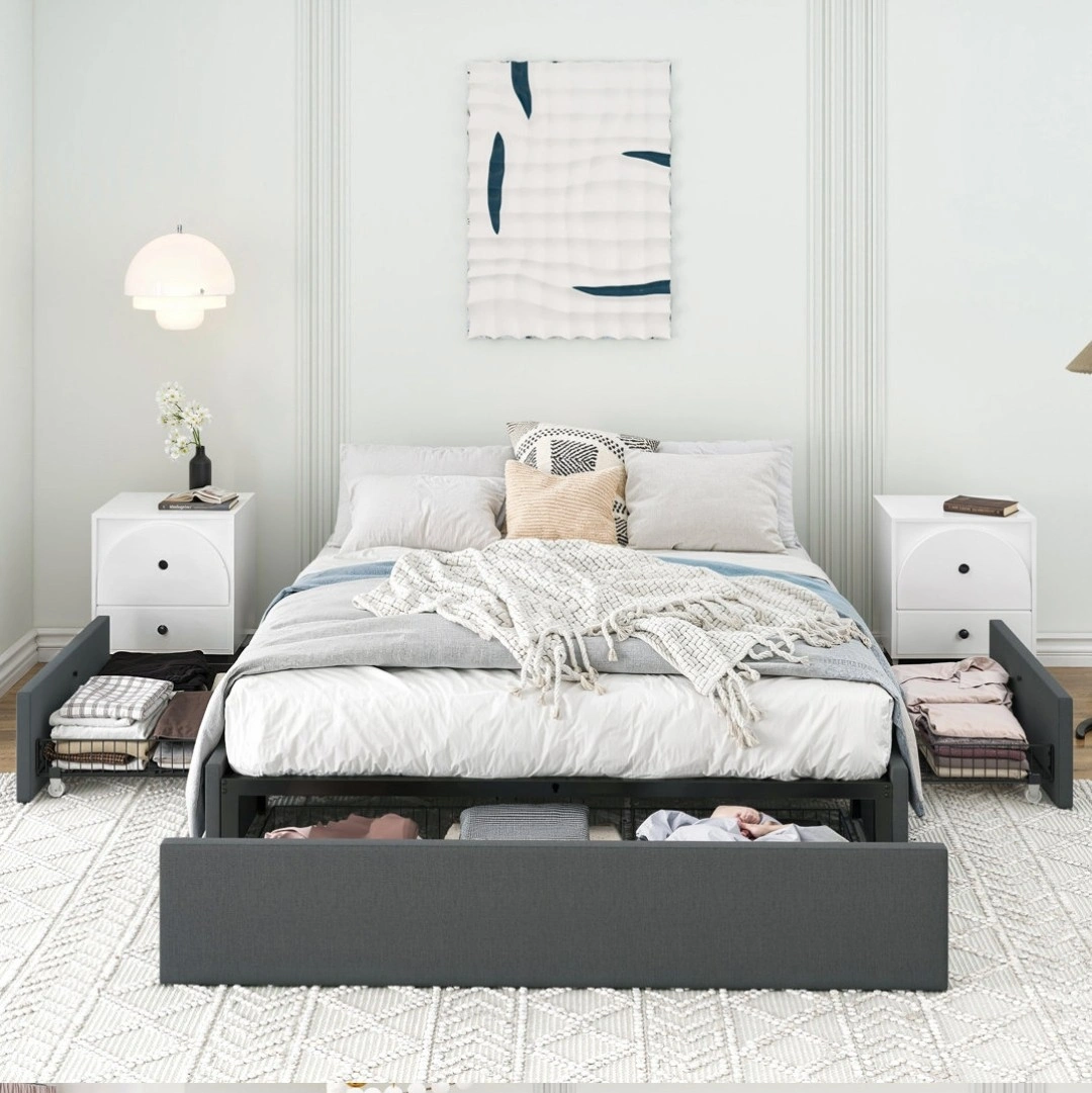The metal frame is designed to fit a queen-size mattress, and the integrated drawers offer convenient storage for clothes, linens, or other items. No need for a box spring the wooden slats support the mattress.