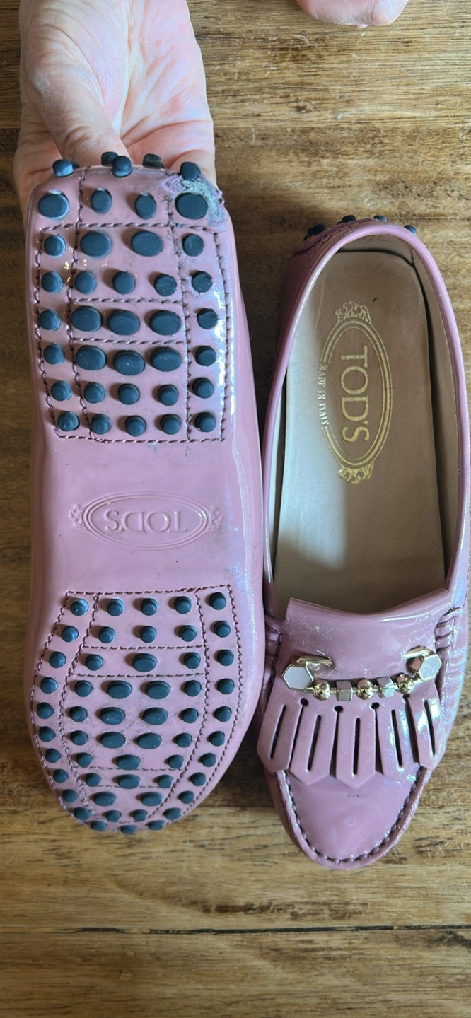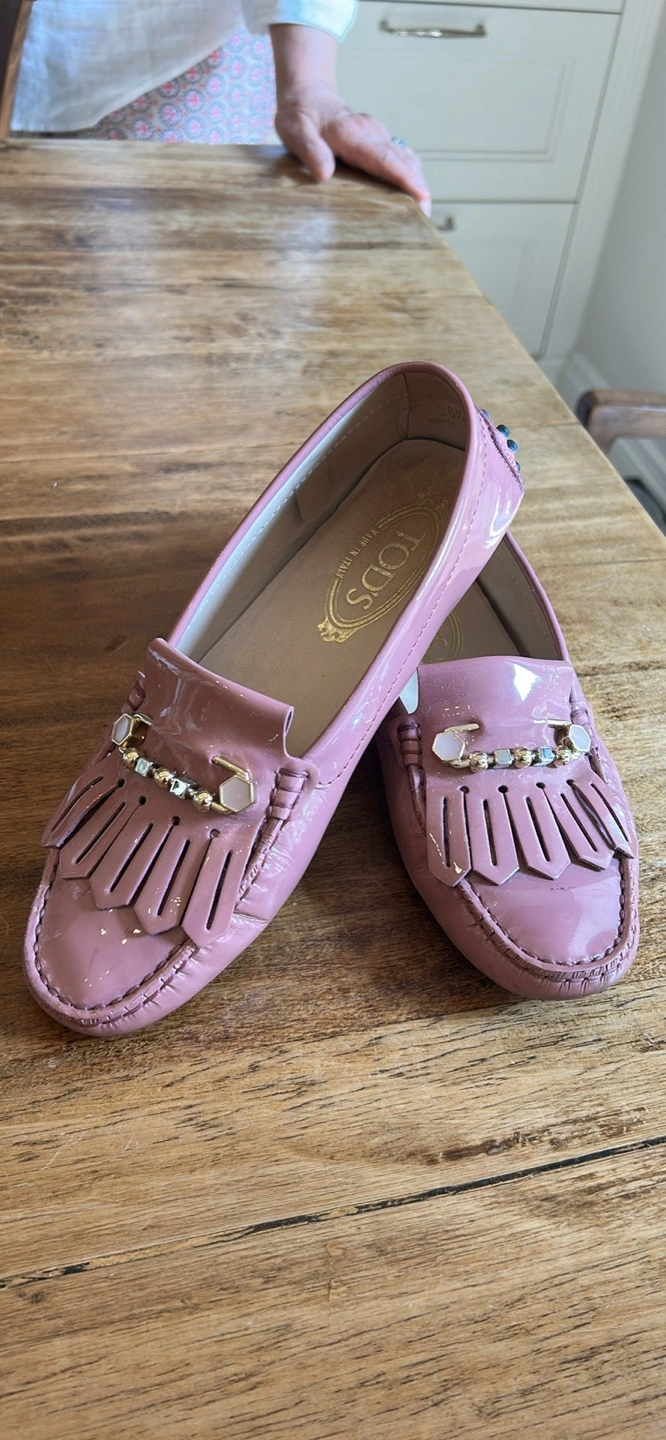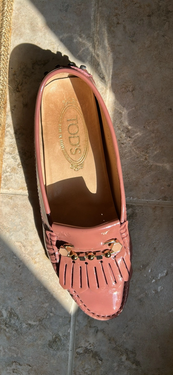 Selling a pair of Tod's loafers in a lovely pink patent leather! They have a cute fringe detail and the classic Tod's rubber pebble sole. These are in used condition, so please check the photos for details Size 6.5