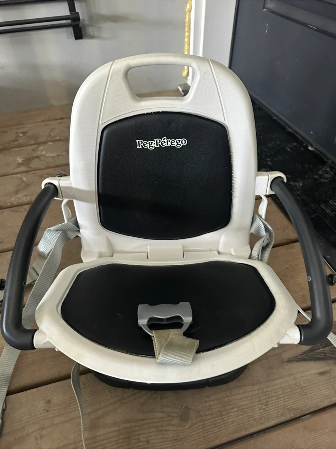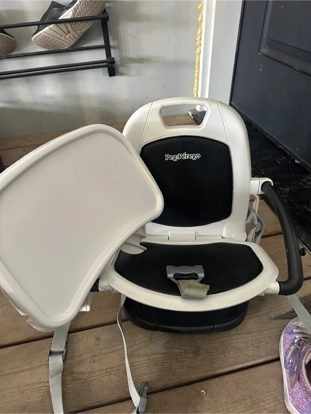 This is a white and black Peg-Pérego booster seat that attaches to a regular chair. It includes a removable tray and adjustable straps for securing your child. It's great for making any chair a high chair.