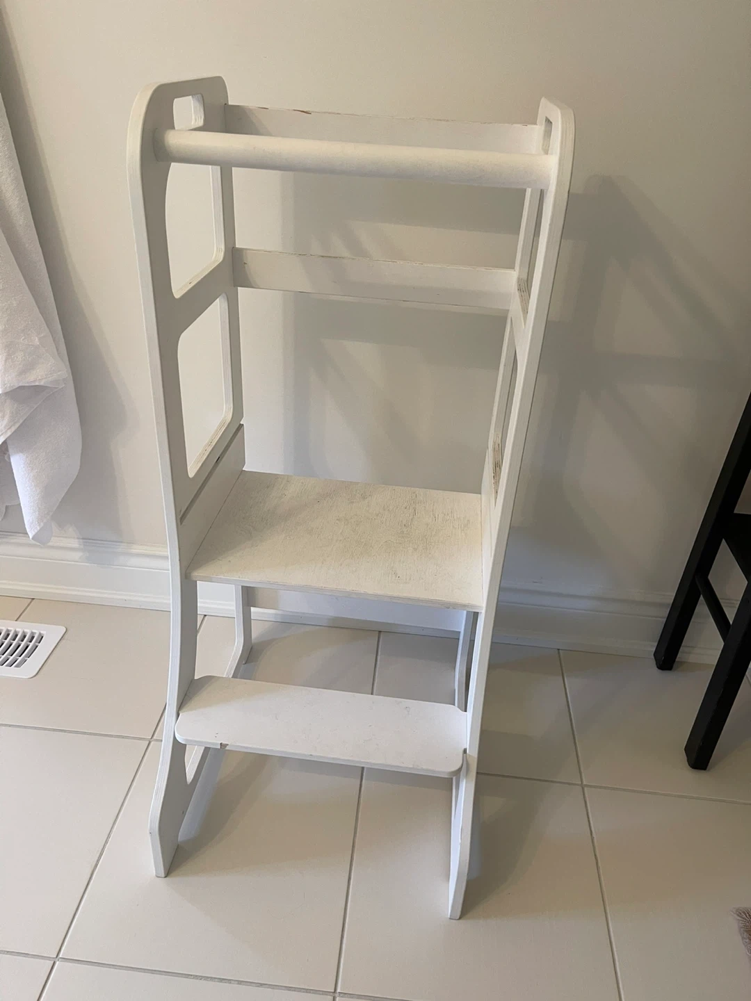 Selling a white toddler learning tower. It's great for helping your little one reach the counter safely. It has some signs of use, but is still in good condition
