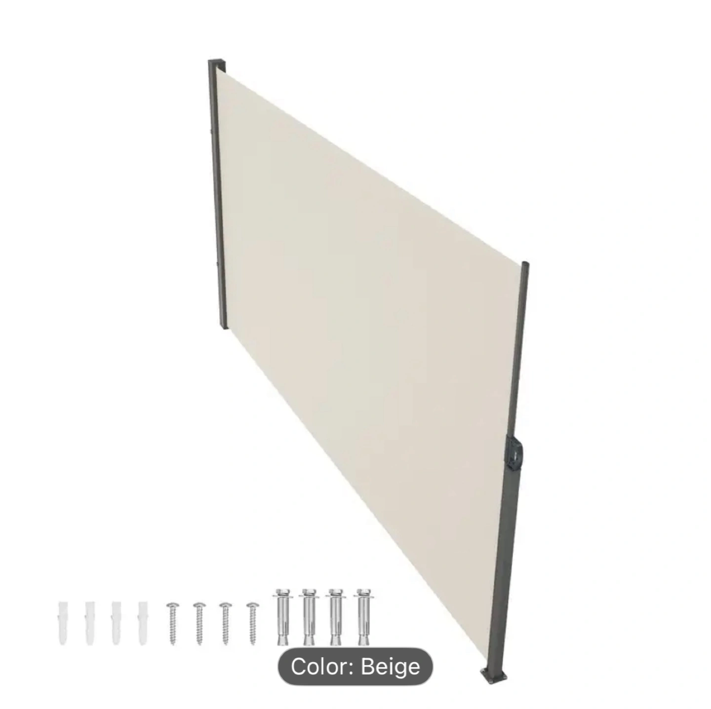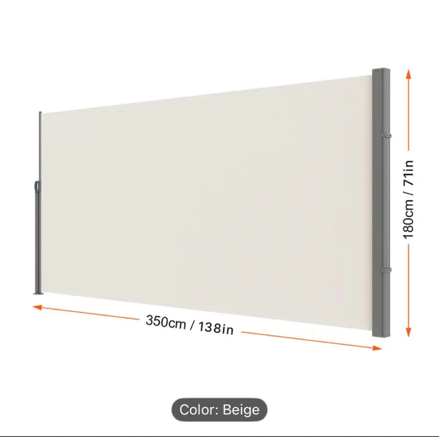 Looking to add some privacy to your patio or deck? This retractable side awning could be just the ticket! It's beige in colour and measures 350cm (138in) in length and 180cm (71in) in height. It also comes with the mounting hardware.
