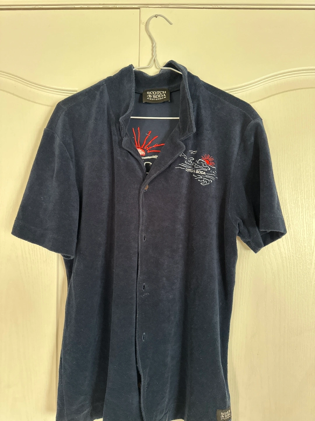 Here's a cool blue terry cloth shirt from Scotch & Soda! It's got some neat embroidery details that add a bit of flair. Perfect for a casual, comfy look!