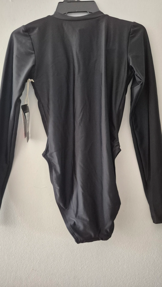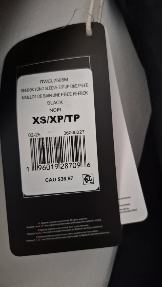 This is a brand new Reebok long sleeve zip up one piece swimsuit in size XS. It's black and has the Reebok logo printed down the front. The tag shows it originally retailed for $36.97 CAD