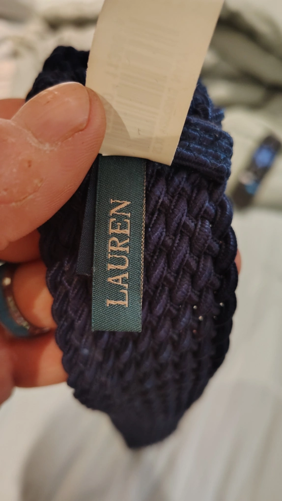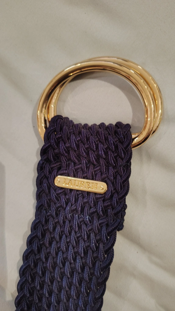Selling a vintage Lauren Ralph Lauren belt in size XL! It's a beautiful navy color with a unique braided design. The belt features a gold-tone double ring buckle, adding a touch of elegance to any outfit. It’s in great condition!