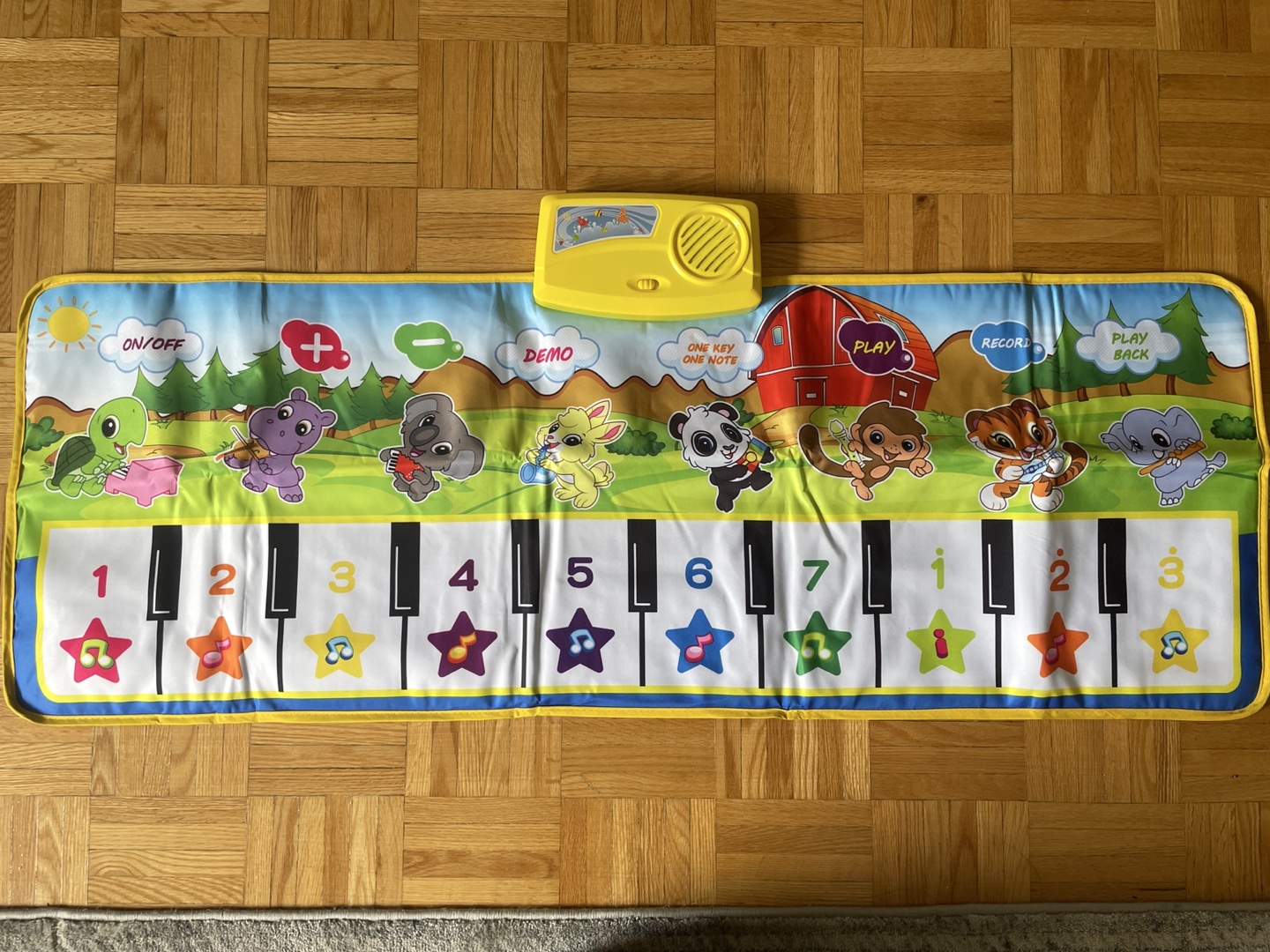 This is a fun musical keyboard play mat for kids! It has different animal sounds and piano keys to encourage exploration and musical creativity. Great for toddlers and young children!