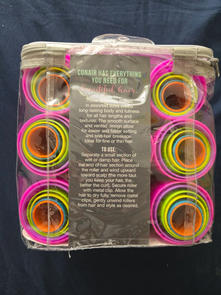 18Brand new set of Conair 75-piece magnetic rollers! These rollers create long-lasting body and fullness for all hair lengths and textures. The smooth surface and vented design allow for easier and faster setting and less hair breakage. Ideal for fine or thin hair. Comes with metal clips and a pink comb