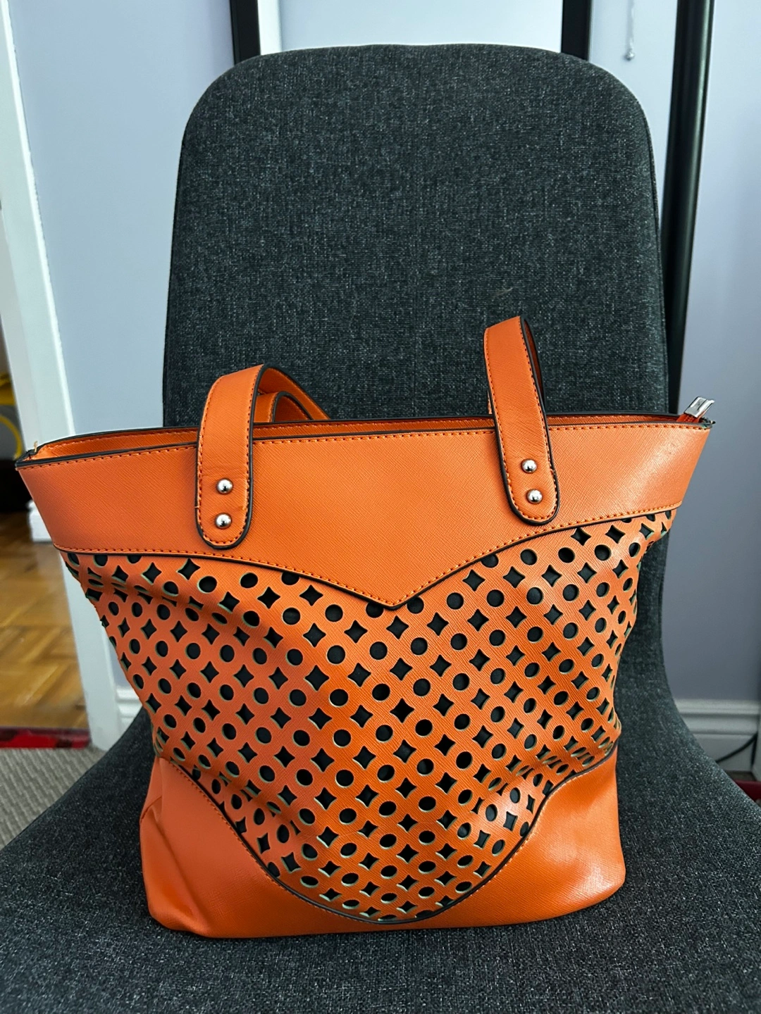 A stylish beautiful orange tote bag, perfect for everyday use. It features a unique laser-cut design on both sides, spacious interior with pockets.