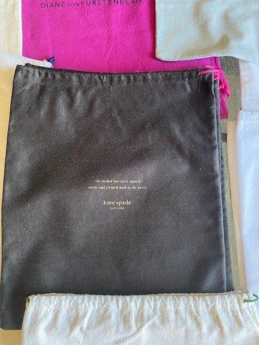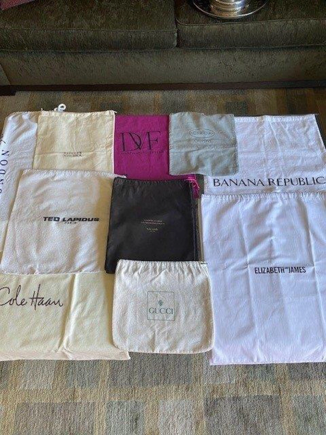 Selling a collection of designer dust bags all new and never used with the exception of Gucci which has a little smudge. Size in inches and prices per bag: Ted Lapidus 15 3/4 x 10. $10 Badgley Mischka 15 3/4 x 12. $15 Elizabeth and James 19 x 22. $18 Circa Joan & David 14 x 10 1/2. $10 Cole Haan 20 x 25. $20 Gucci (little smudge) 10 3/4 x 12. $15 Banana Republic 14 x 19. $10 Kate Spade (4 avail) 13 1/4 x 11 1/4. $10 Diane Von F 19 x 15. $15 Crab Tree&Evelyn 24 x 17 3/4. $20 These are great for protecting your shoes, handbags, and other accessories. From a PF and SF home. Pickup only in the St Lawrence market area of downtown Toronto. Cash only.