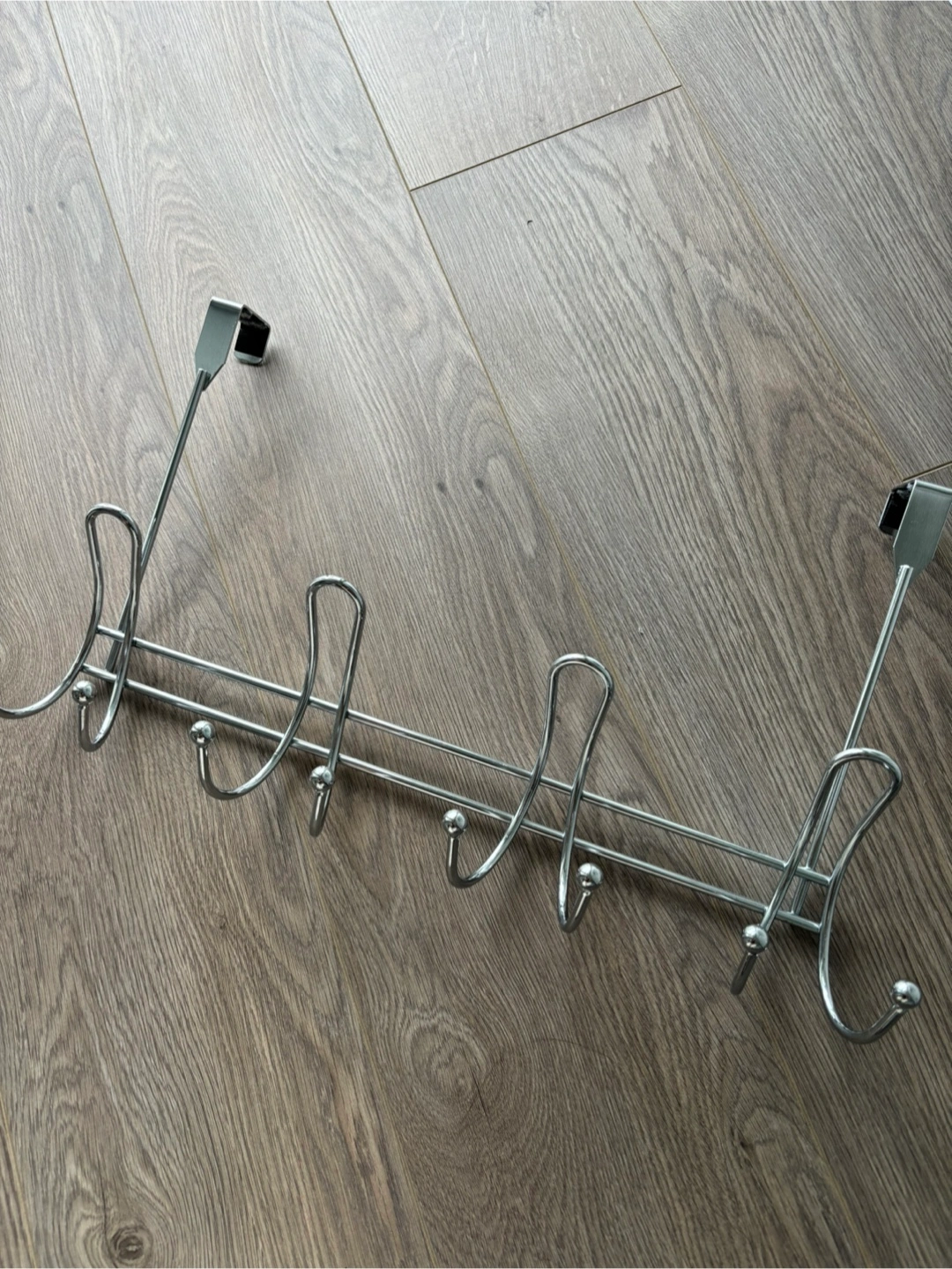 Declutter your space with this handy over-the-door hook rack! It's perfect for adding extra hanging space in your closet, bathroom, or any room where you need a little more organization. Easy to install and super convenient! It’s barely used, does not fit under my door