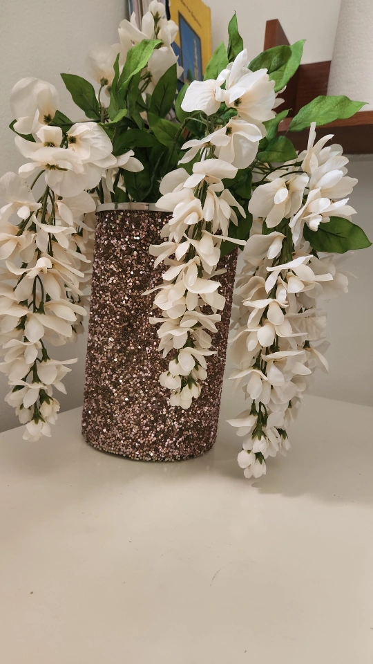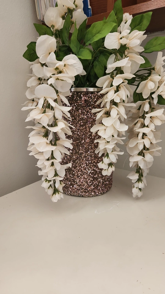 This is a beautiful floral arrangement in a glittery vase. It would be a lovely addition to any room!