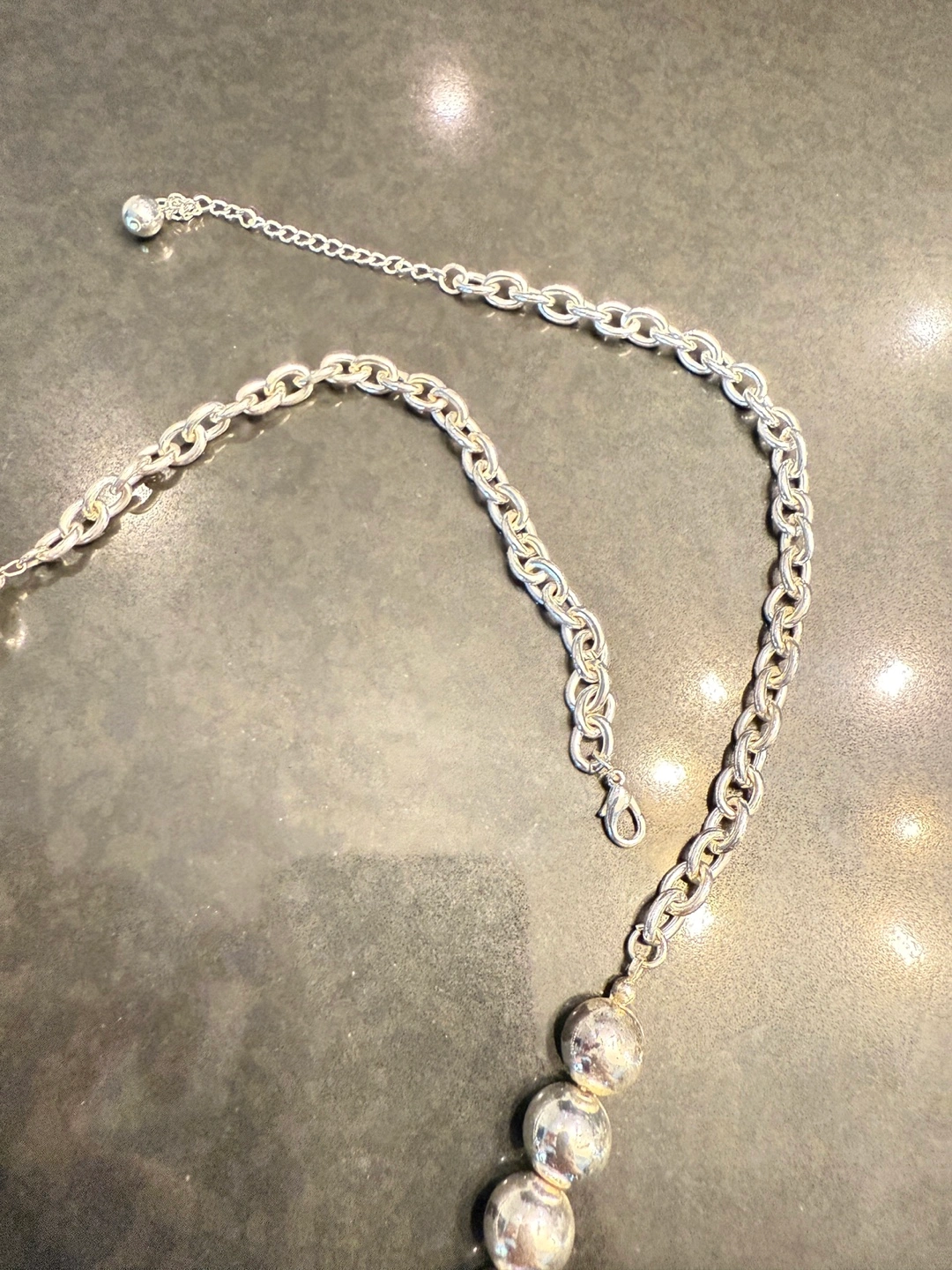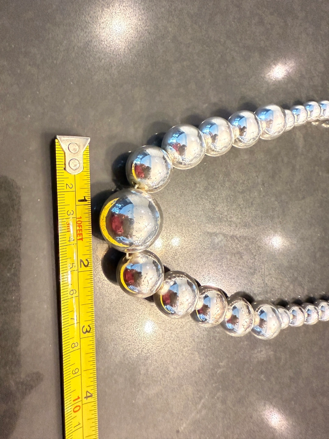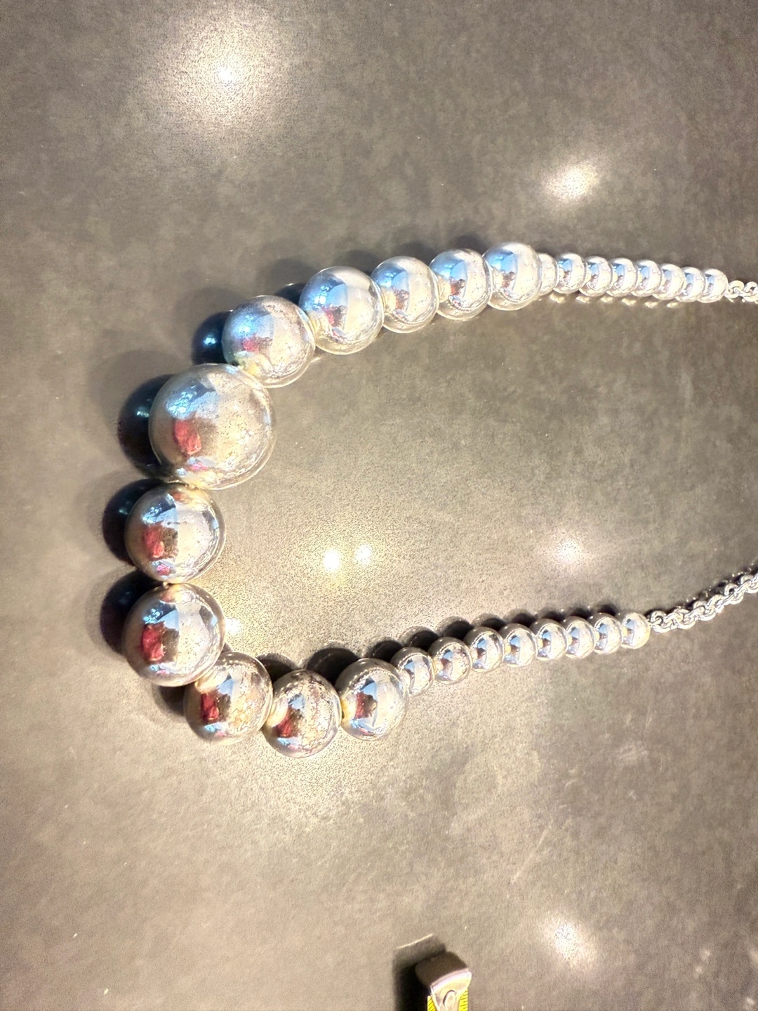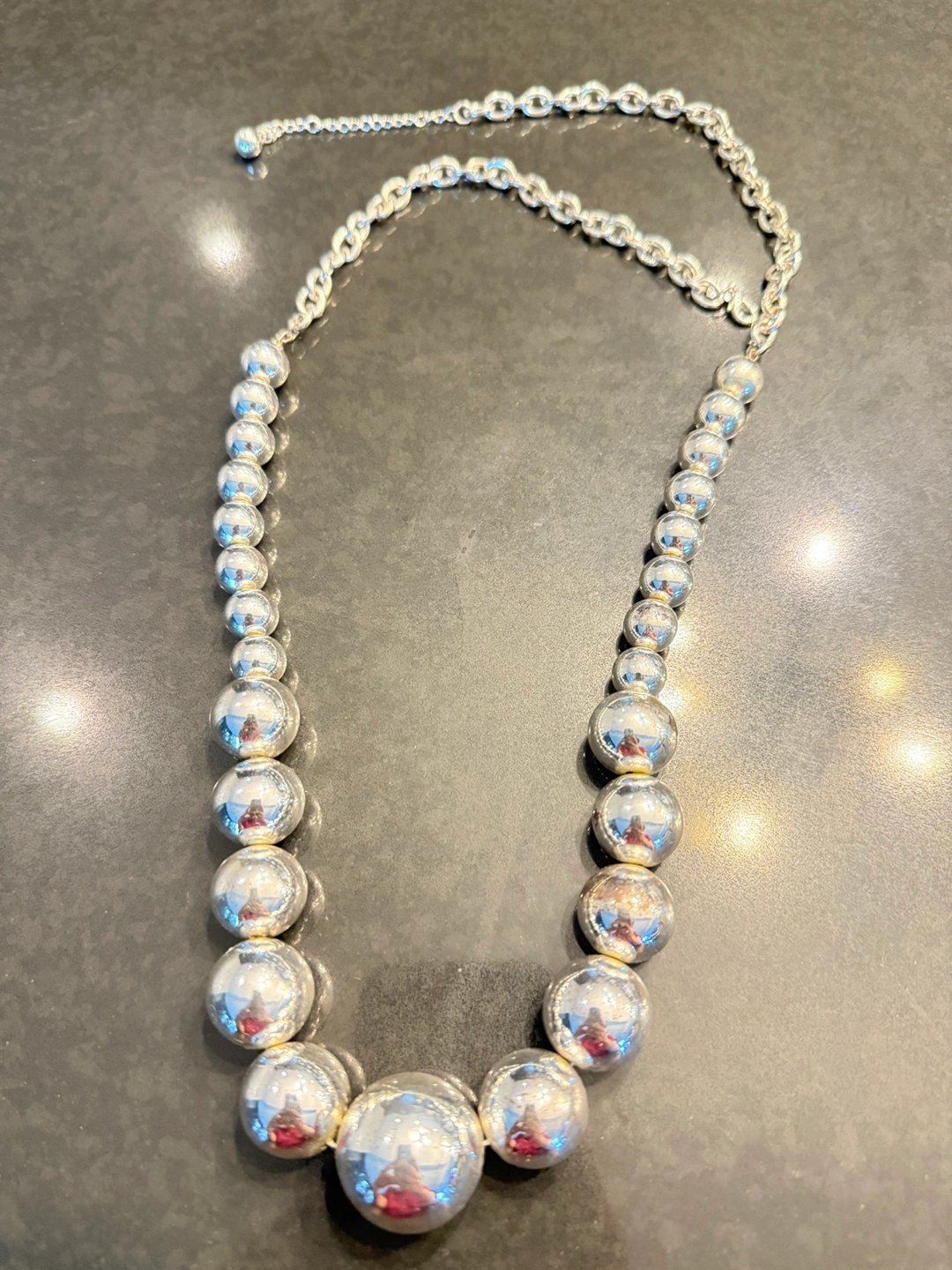 481A lovely silver-tone beaded necklace! The beads graduate in size, creating a unique and eye-catching design. It's in great condition and ready to add a touch of elegance to your wardrobe