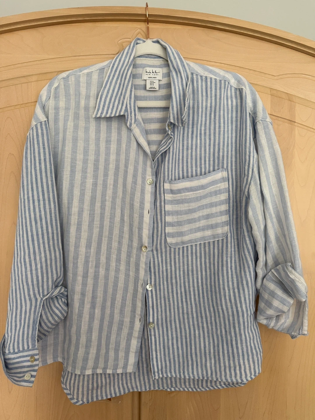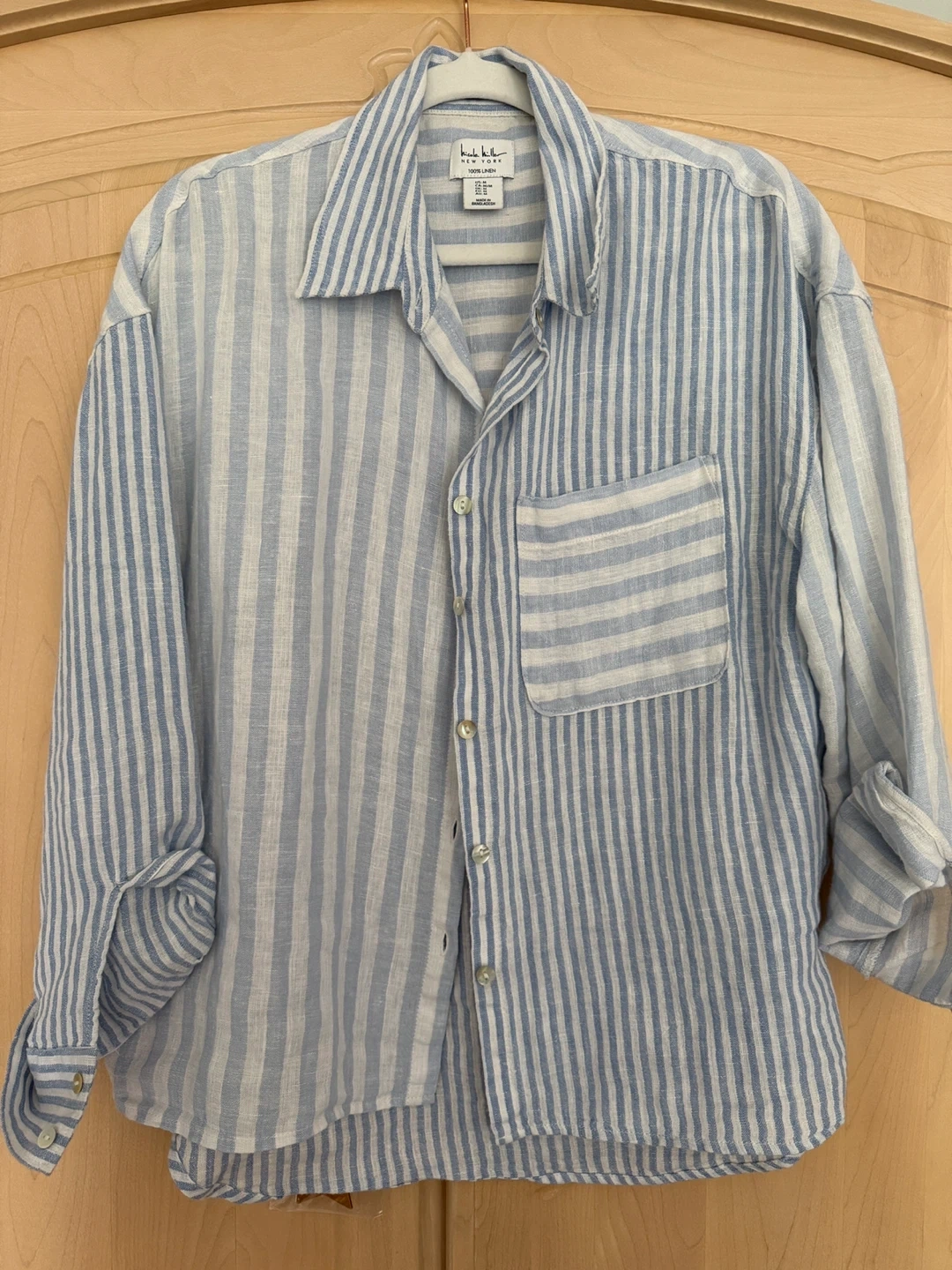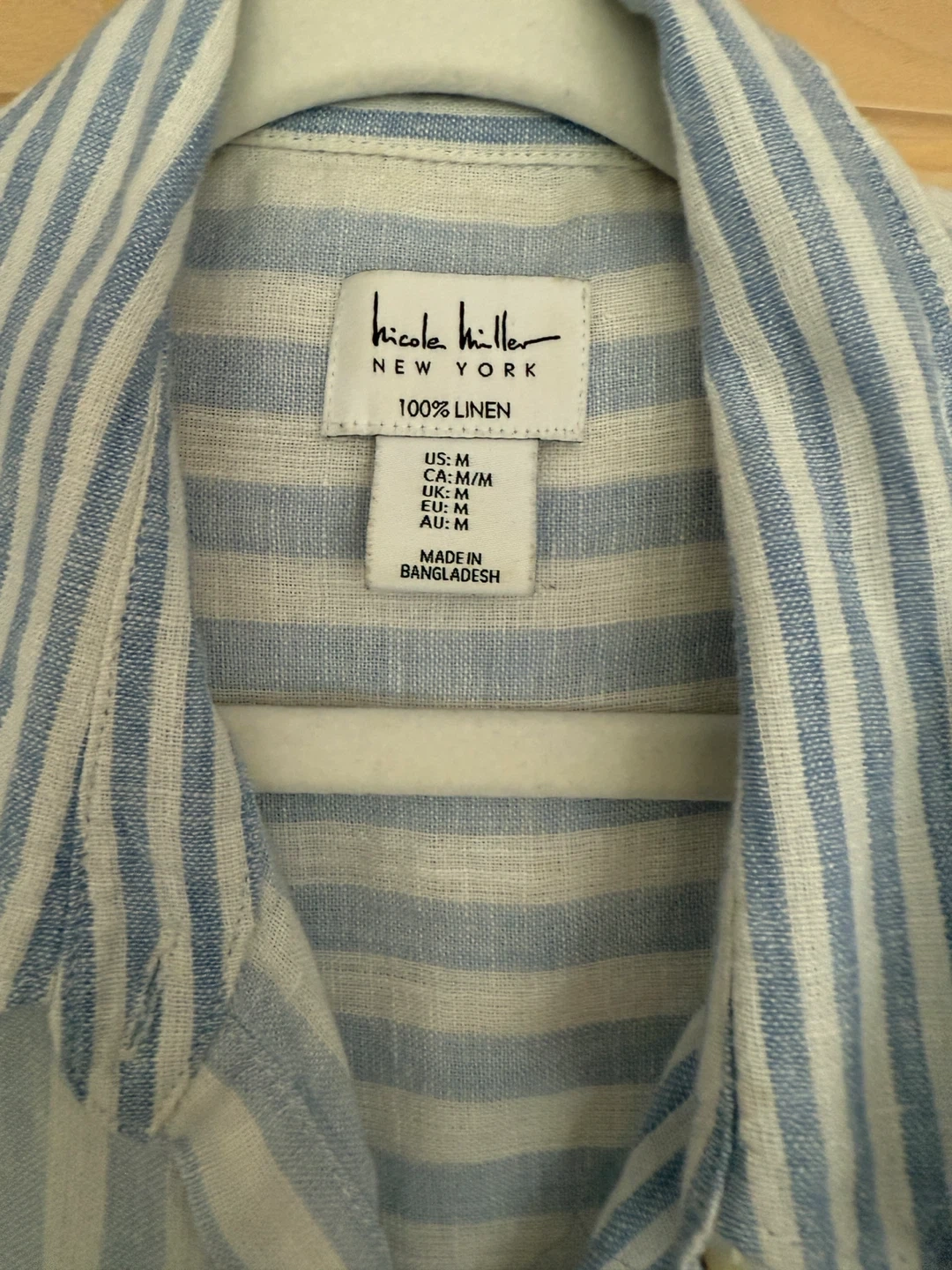 This Nicole Miller shirt is a stylish addition to any wardrobe! It features a blue and white striped pattern and is made from a comfortable linen blend. Perfect for a casual day out or dressed up for a more sophisticated look. Size medium to large chest 22/5