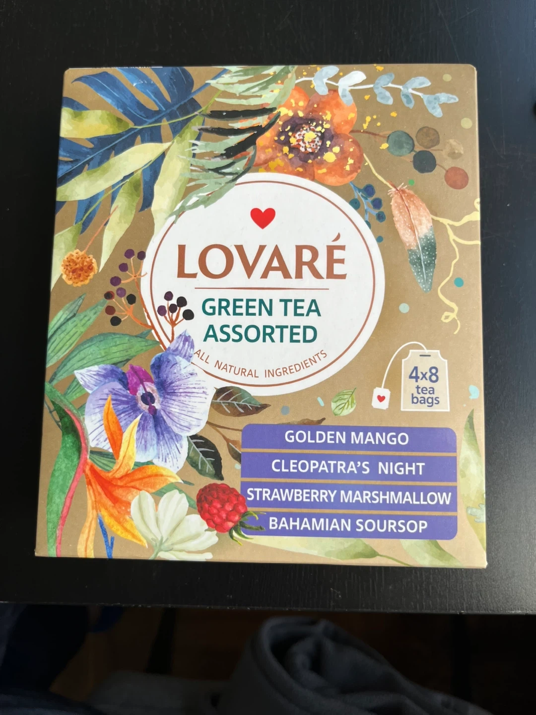 Selling a Lovaré Green Tea Assorted sealed box! It includes 4 different flavours: Golden Mango, Cleopatra's Night, Strawberry Marshmallow, and Bahamian Soursop. Each flavour has 8 tea bags, for a total of 32 tea bags. All natural ingredients!