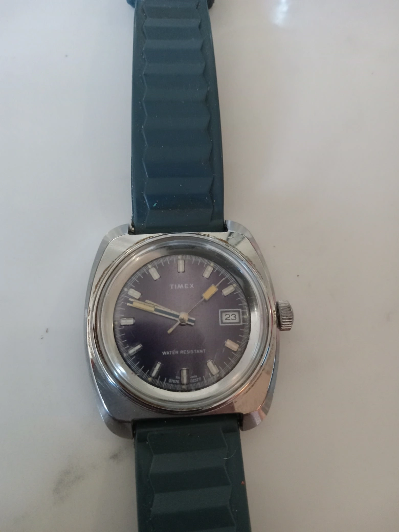 Selling a vintage Timex watch! It has a silver-tone case and a blue band. The back of the watch indicates it's water resistant and has a stainless steel back. The band is marked 'Alaska Made in France'. A cool vintage piece!