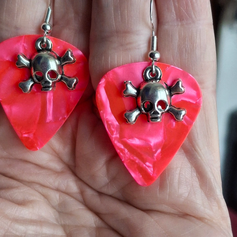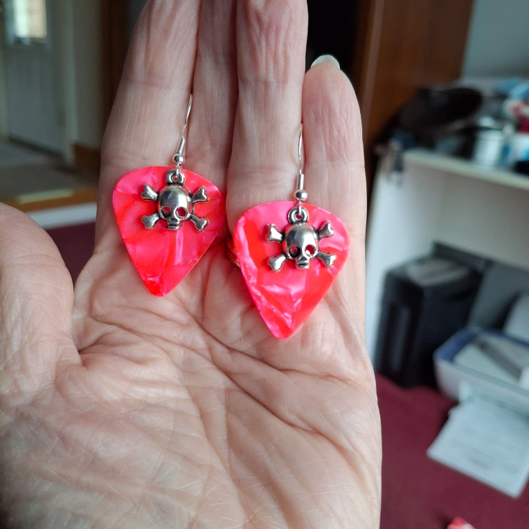 Selling a pair of fun skull earrings! They're made from guitar picks and have a silver skull and crossbones charm. Perfect for adding a bit of edge to your look