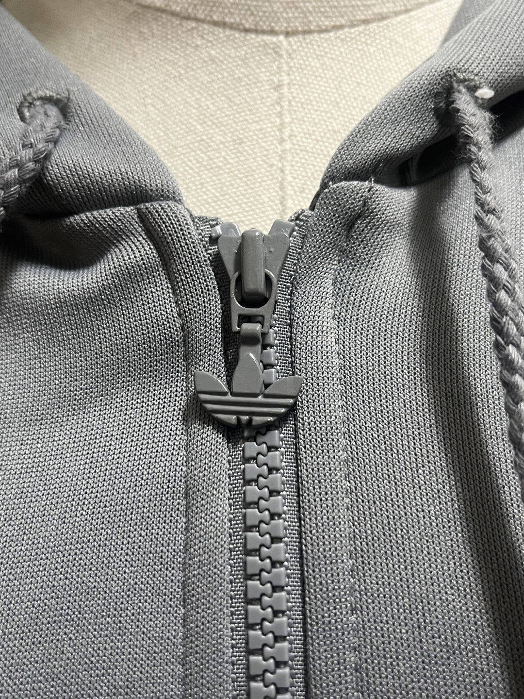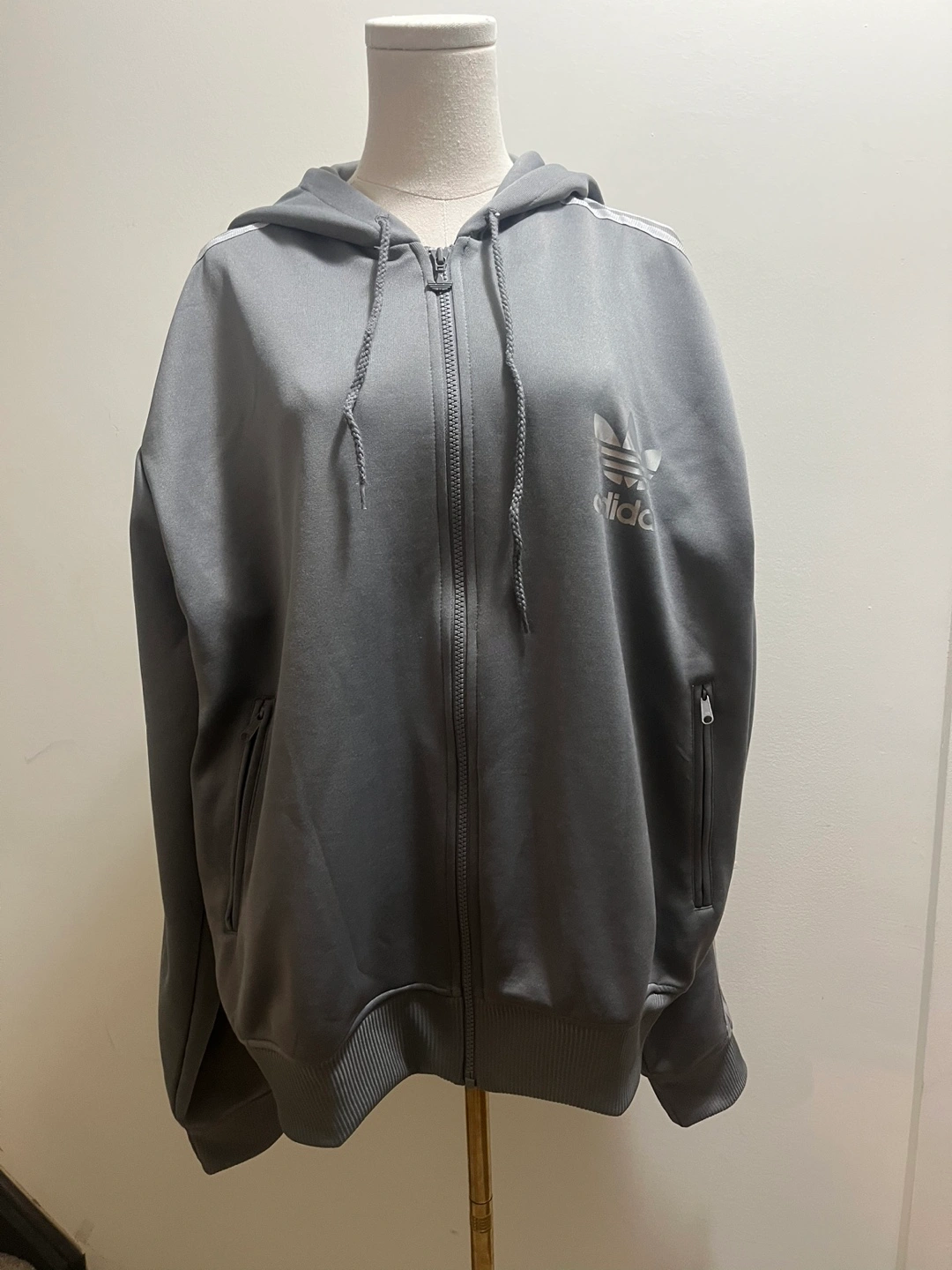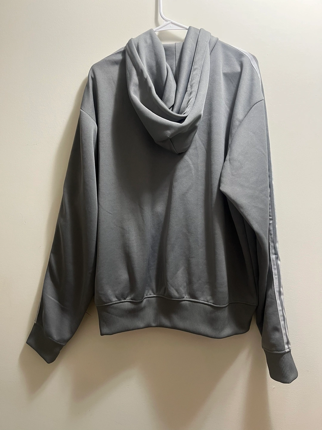 Grey hoodie with Adidas logo and signature stripes down the shoulder. Full-zip design.