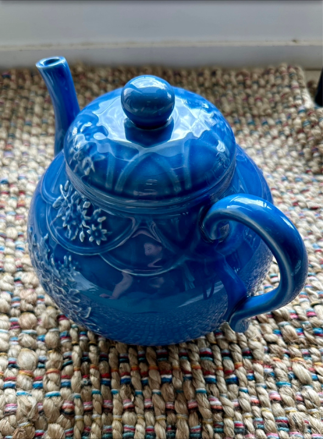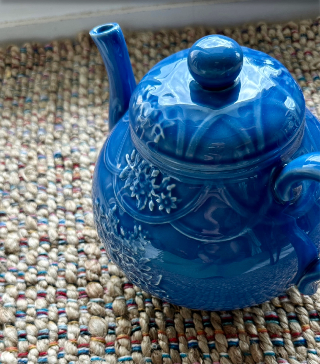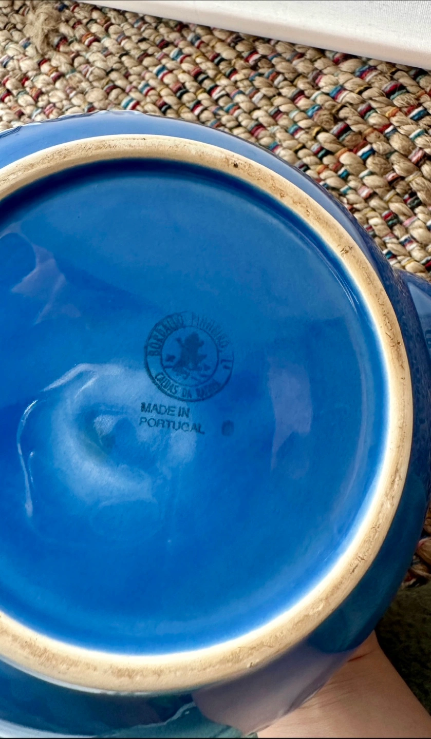 1000+Selling vintage blue teapot by Bordallo Pinheiro. It's made in Portugal and has a unique design. There is a small chip on the spout, as pictured.
