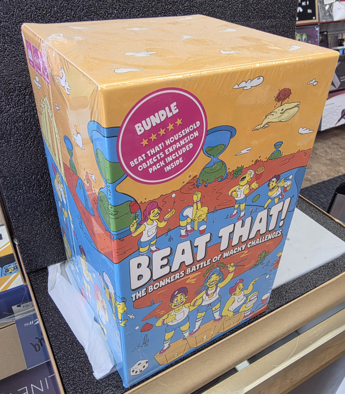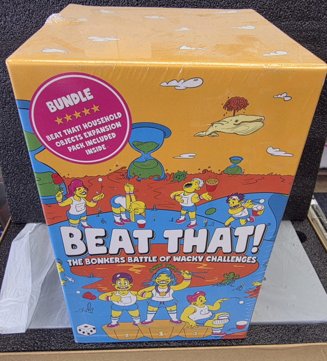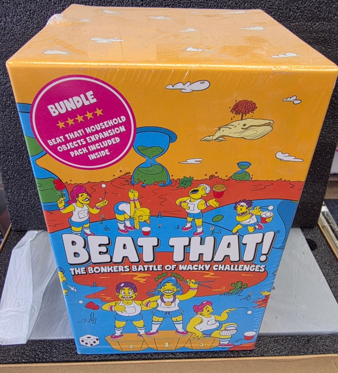 Get ready for some wacky fun with Beat That! The Bonkers Battle of Wacky Challenges! This bundle includes the household objects expansion pack inside, so you'll have even more ridiculous challenges to try. Limber up and prepare to bounce, flip, stack, hop, roll, blow, and catapult your way to victory in the world's wackiest party game! Great for kids and adults alike, this fast and funny party game guarantees belly busting laughter by the bucketload!