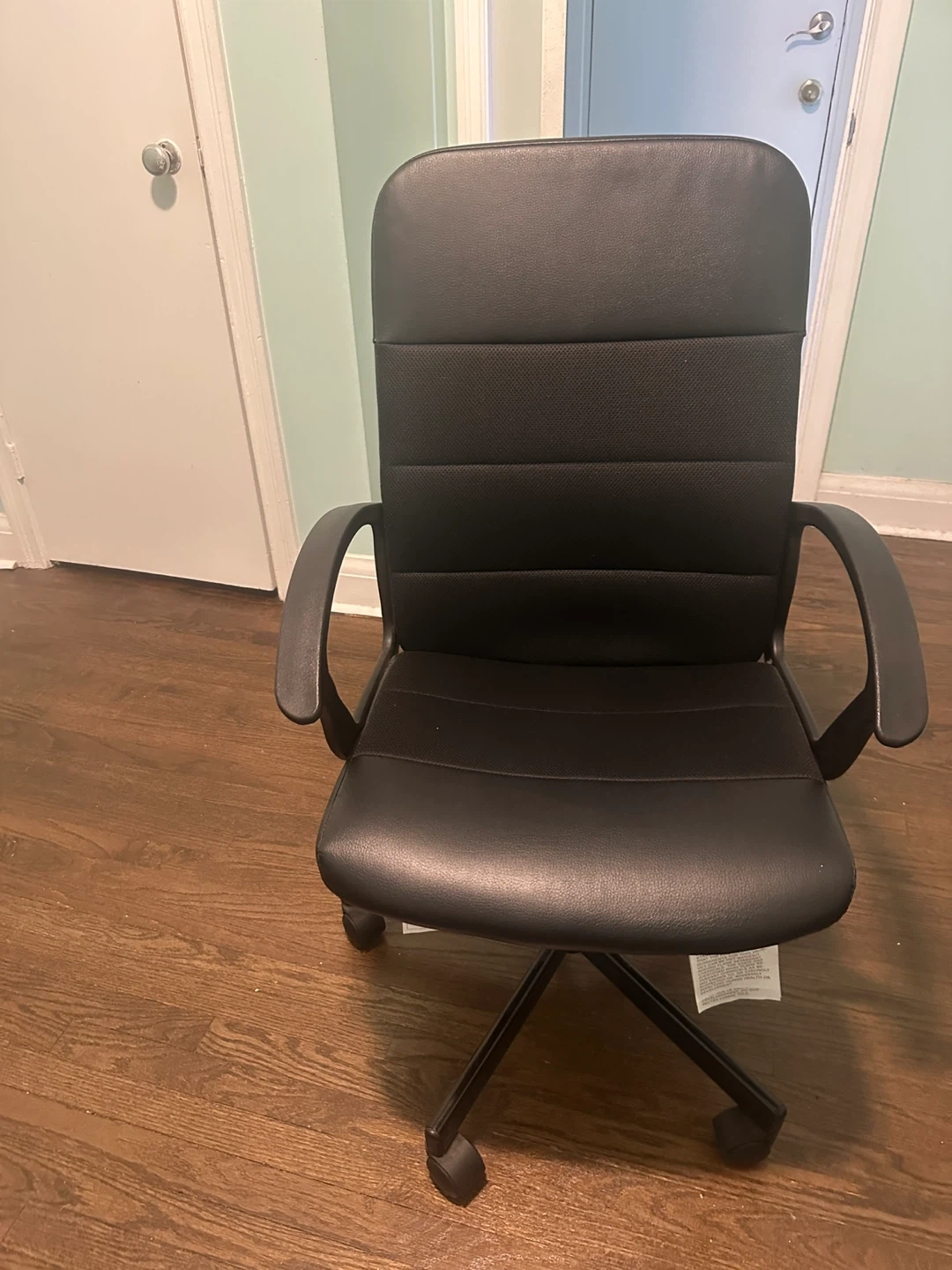 Selling a black office chair in good condition. It's perfect for a home office or student desk. The chair is height adjustable and has a comfortable backrest. It also features armrests for added comfort. It's ready for a new home!