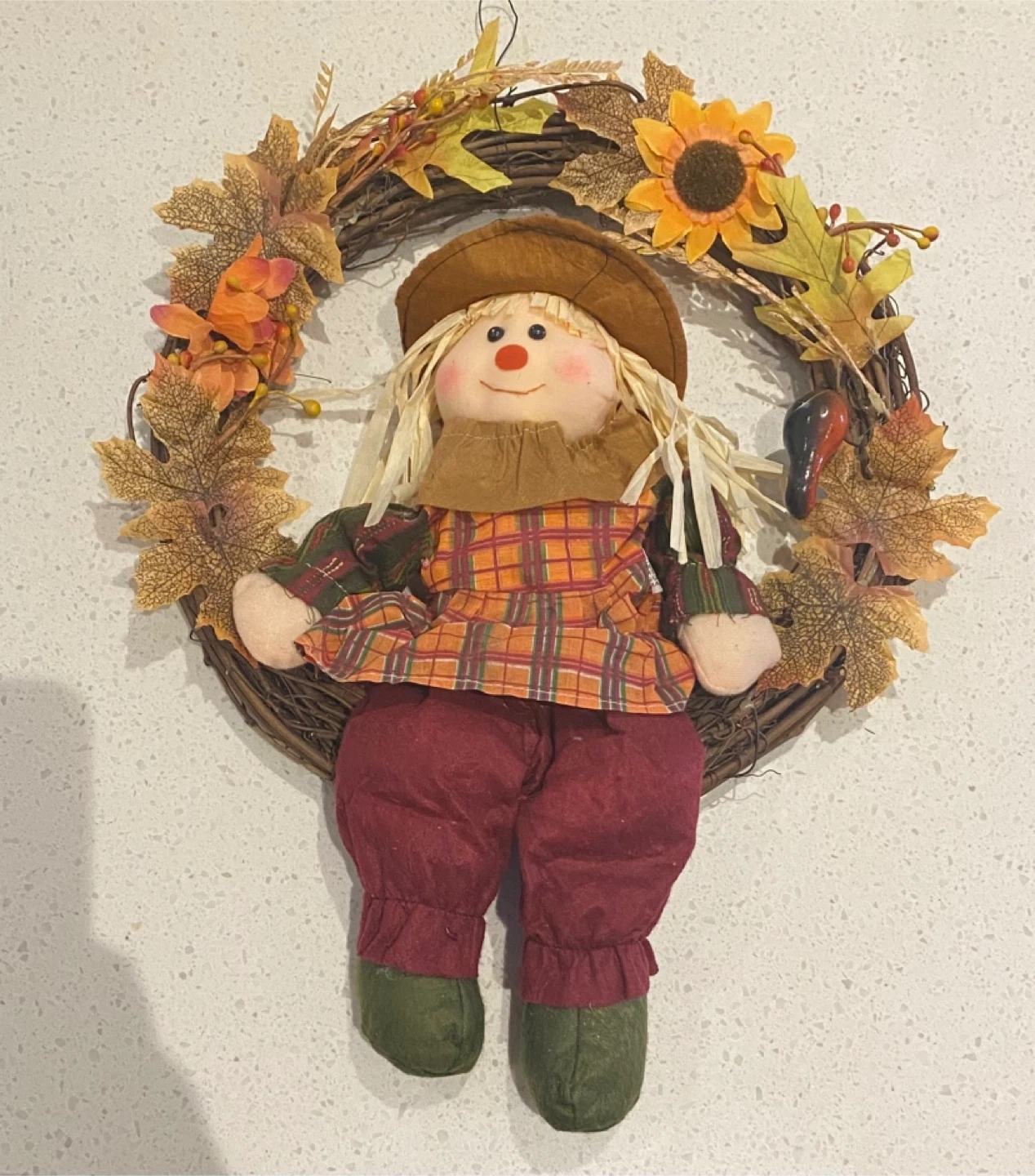 220This is a cute fall scarecrow wreath decoration! It's perfect for adding a touch of autumn charm to your home. 14” diameter. Pick up at Weston and Eglinton.