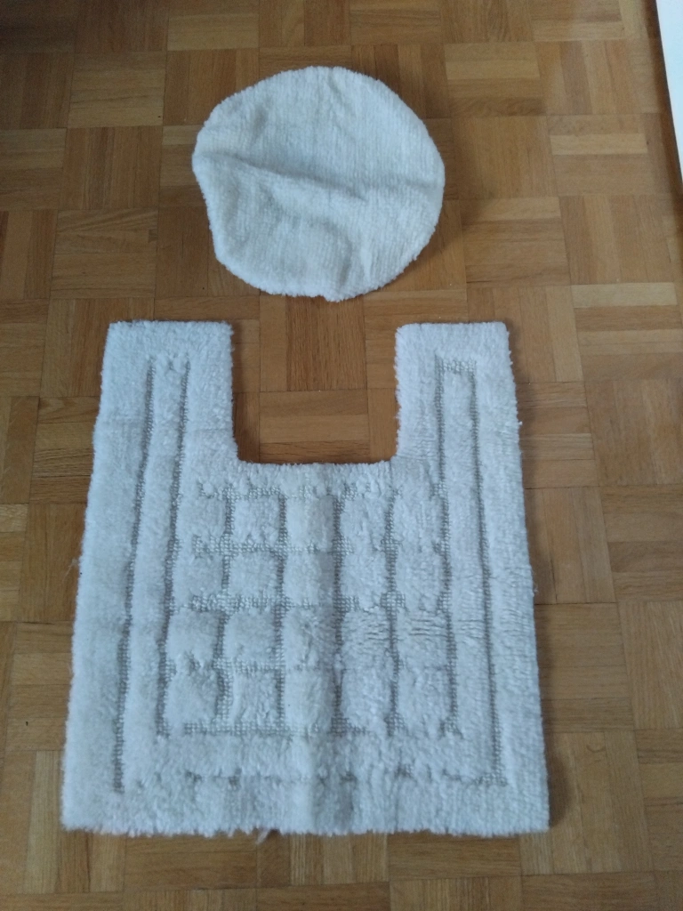 Selling a white bathroom rug set that includes a toilet contour mat and a bath mat. They're in great condition and ready to add a clean, fresh look to your bathroom!