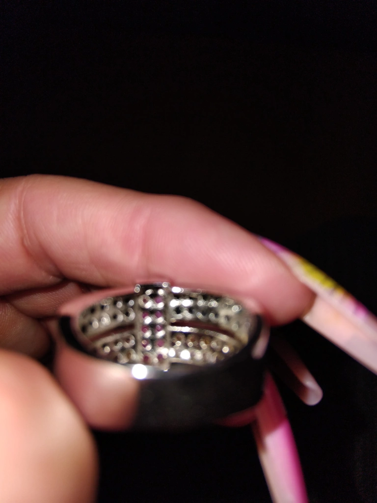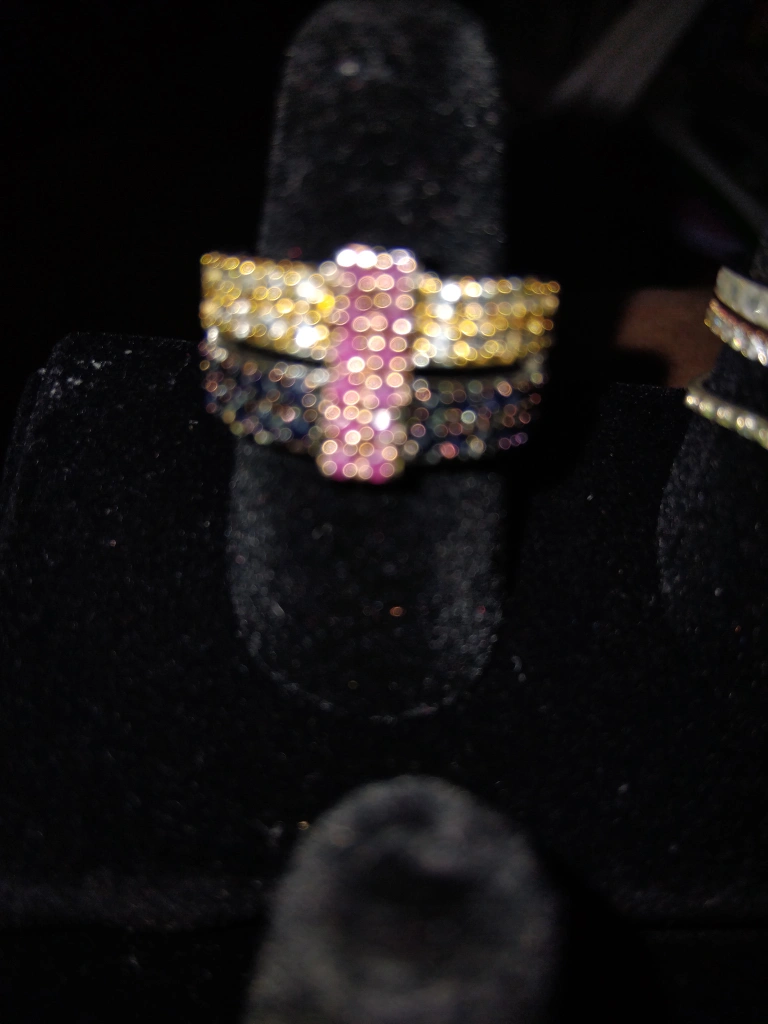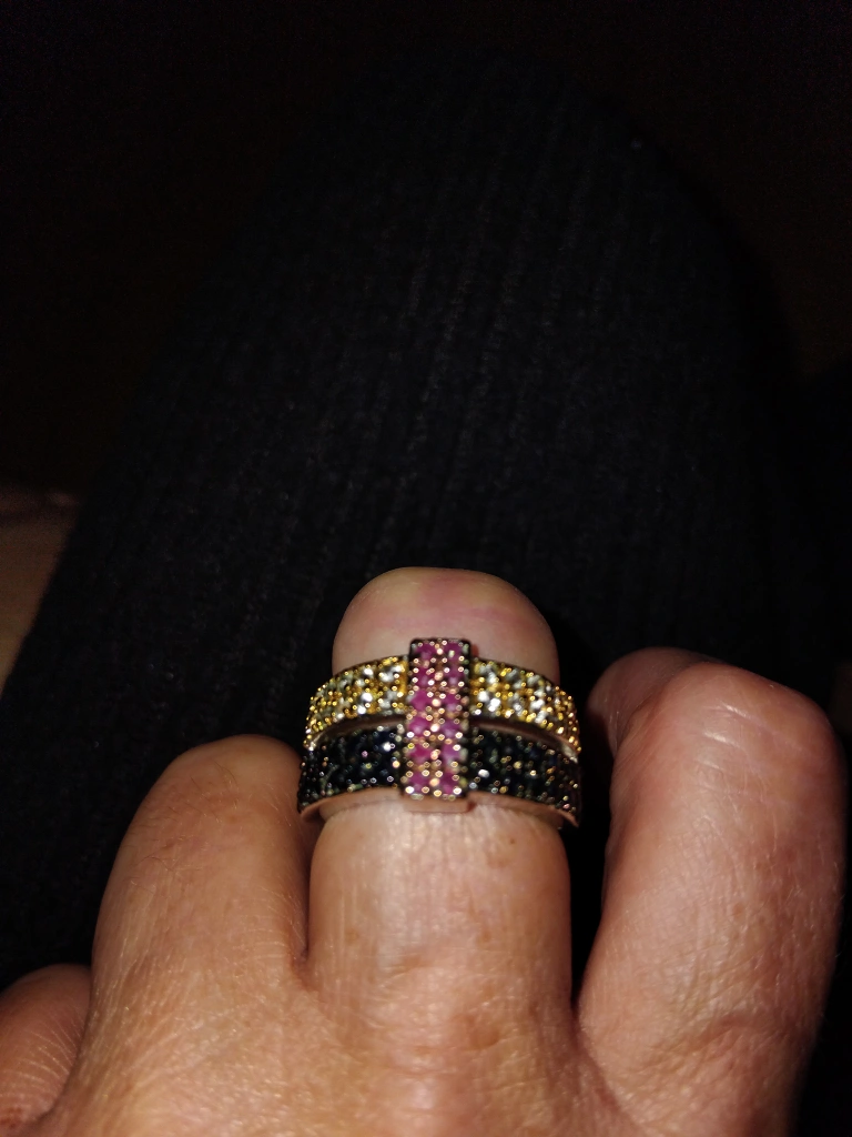 This ring features gold, black, and pink stones. It's a beautiful piece that would make a great addition to any jewellery collection