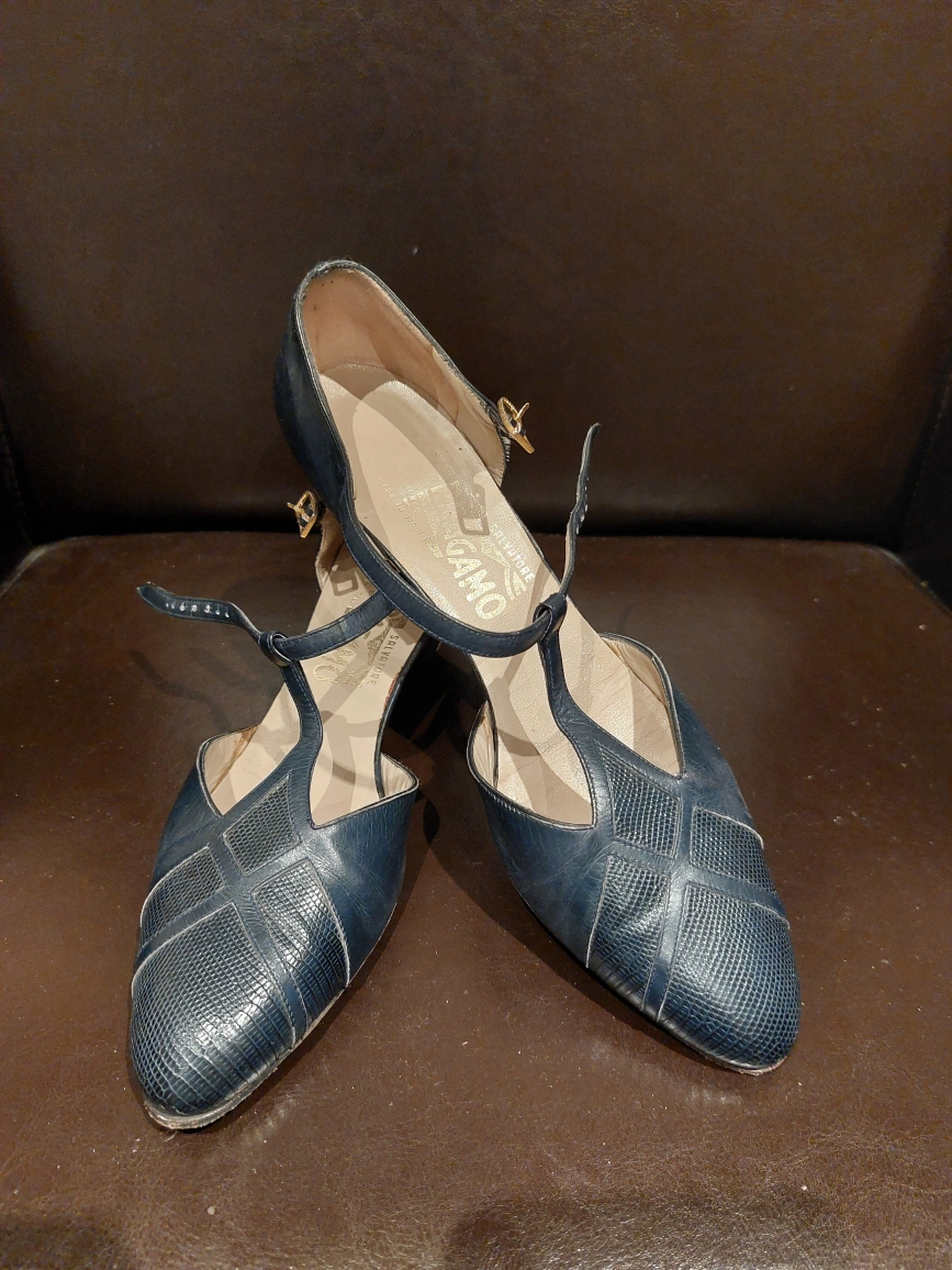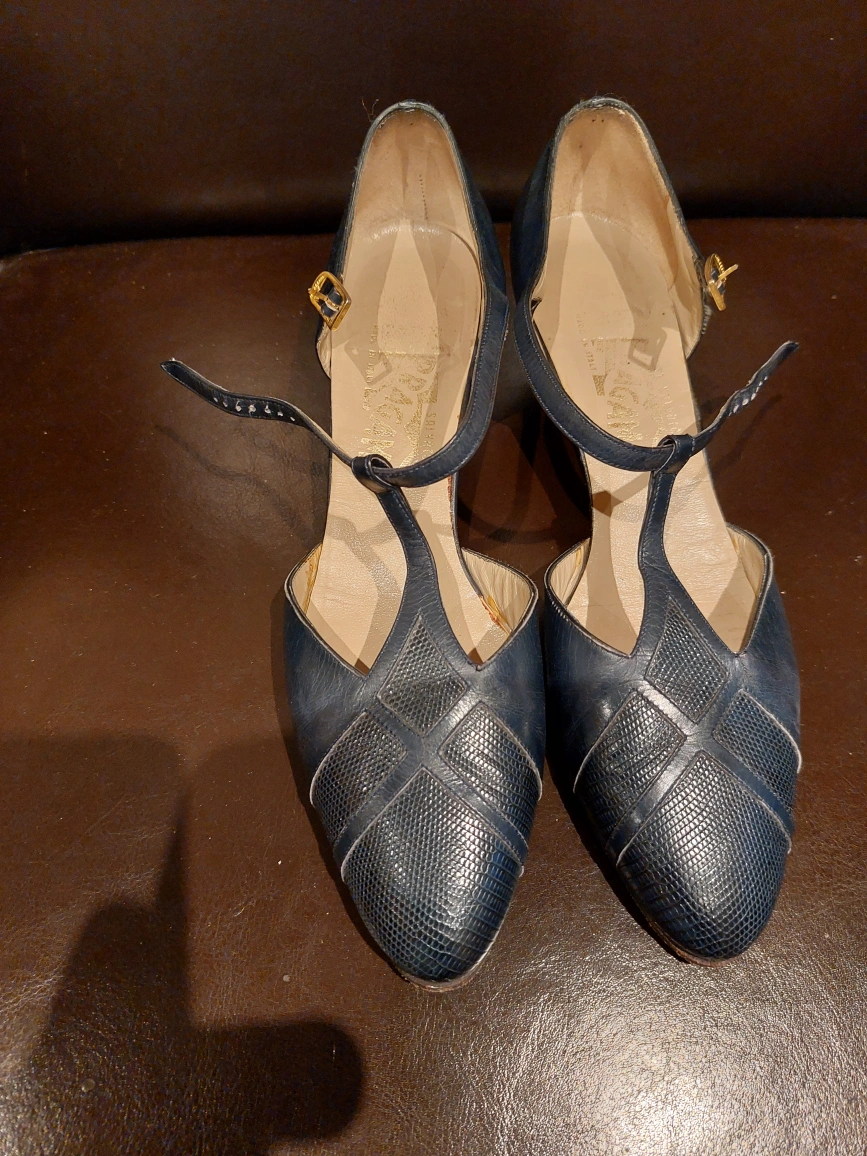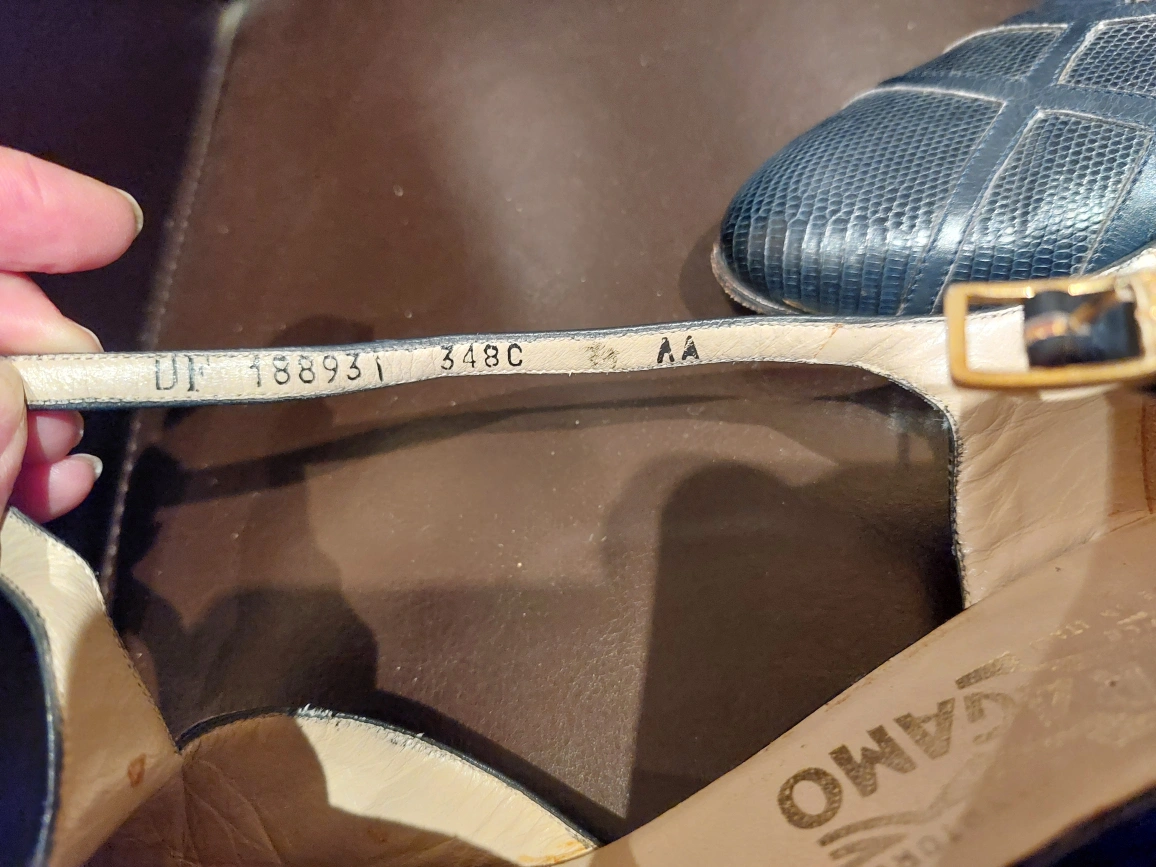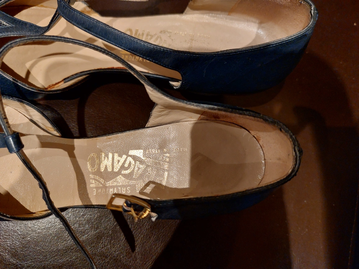Selling a pair of vintage Salvatore Ferragamo heels in a lovely blue genuine leather. They are marked as size 6.5 AA. They have soft real leather lining, very comfortable. They are in used condition, as shown in the photos. The heels are 4.5 cm high. Perfect for adding a touch of vintage style to your wardrobe!