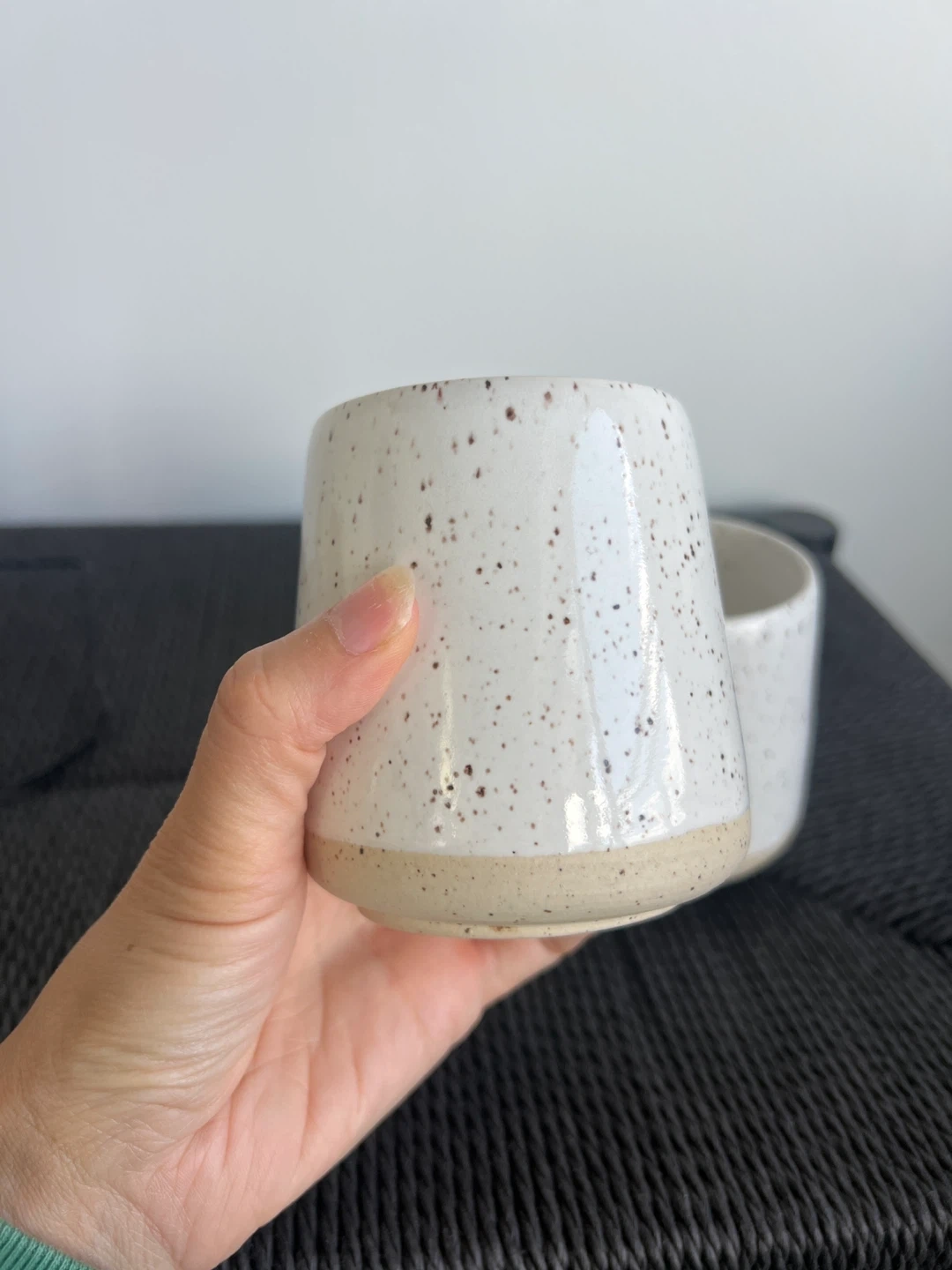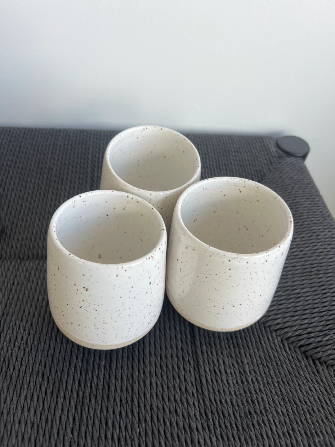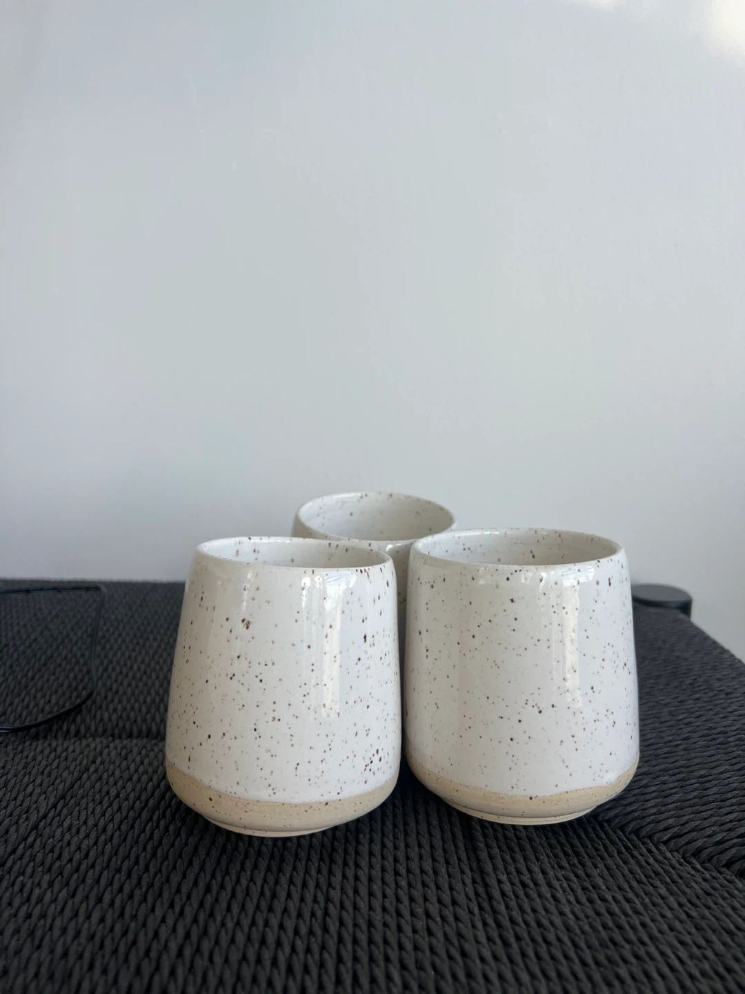 Selling a set of three speckled ceramic tumblers. They're perfect for coffee, tea, or any beverage you like! These tumblers have a unique, handcrafted feel and would look great in any kitchen or dining room