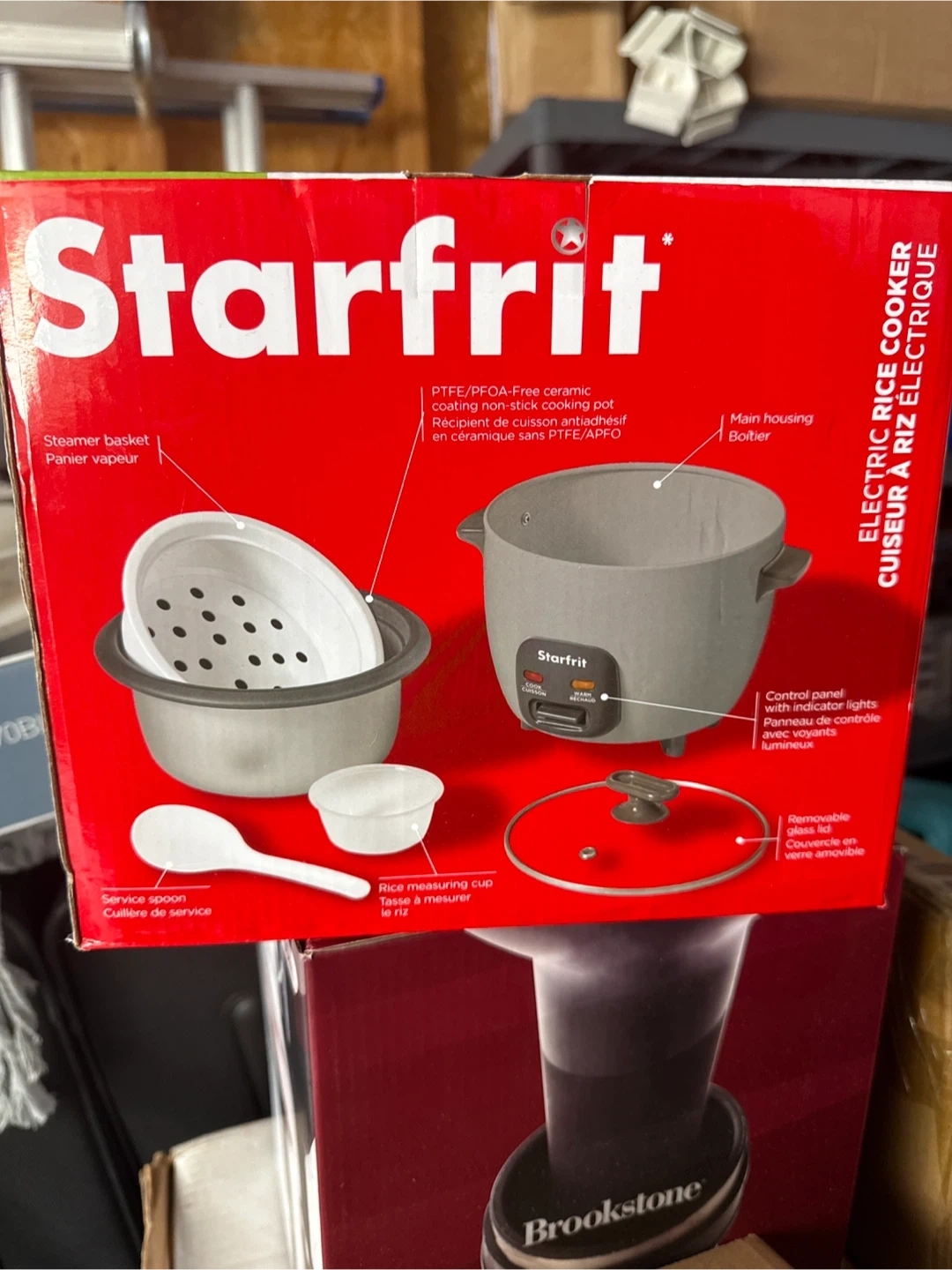 I'm selling a Starfrit Electric Rice Cooker. It comes with a steamer basket, service spoon, and rice measuring cup. The cooking pot has a PTFE/PFOA-Free ceramic non-stick coating. It also has a removable glass lid.