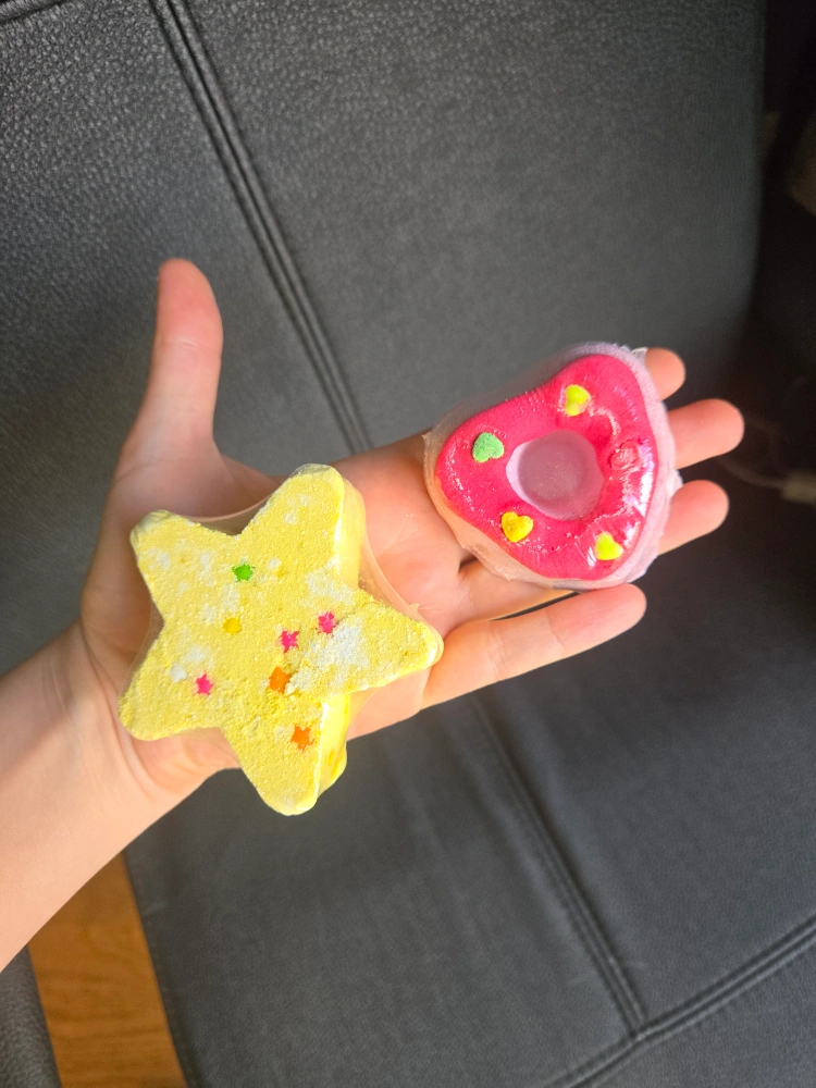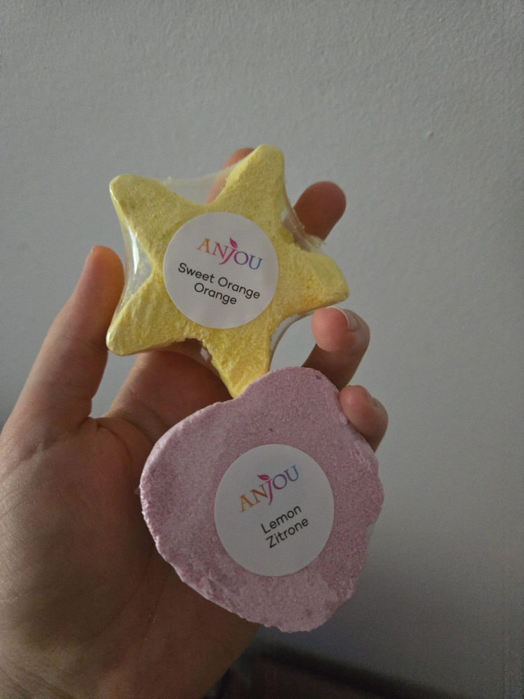 Two cute bath bombs from Anjou! One is star-shaped with a sweet orange scent, and the other is heart-shaped with a refreshing lemon scent.