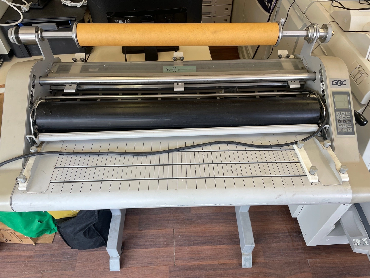 Laminate at amazing speeds with GBC Discovery 80 High Speed 31" Laminator. The laminator is designed to meet the needs of commercial printing and in-house production environments. It can laminate at speeds of up to 20' per minute or four times faster than most office laminators. It can accommodate posters up to 31" wide or two-up 12" x 18" sheets and handles roll up to 2000 feet for continuous operation. Crowned rollers and infrared heating systems ensure consistent professional-level output is maintained even at-8 higher speeds. An easy-to-read LCD panel displays temperature, speed, job settings, and ready and wait-for controls. Memory function conveniently saves and recalls up to nine different set-up positions for speed and temperature. Roll Laminator Description